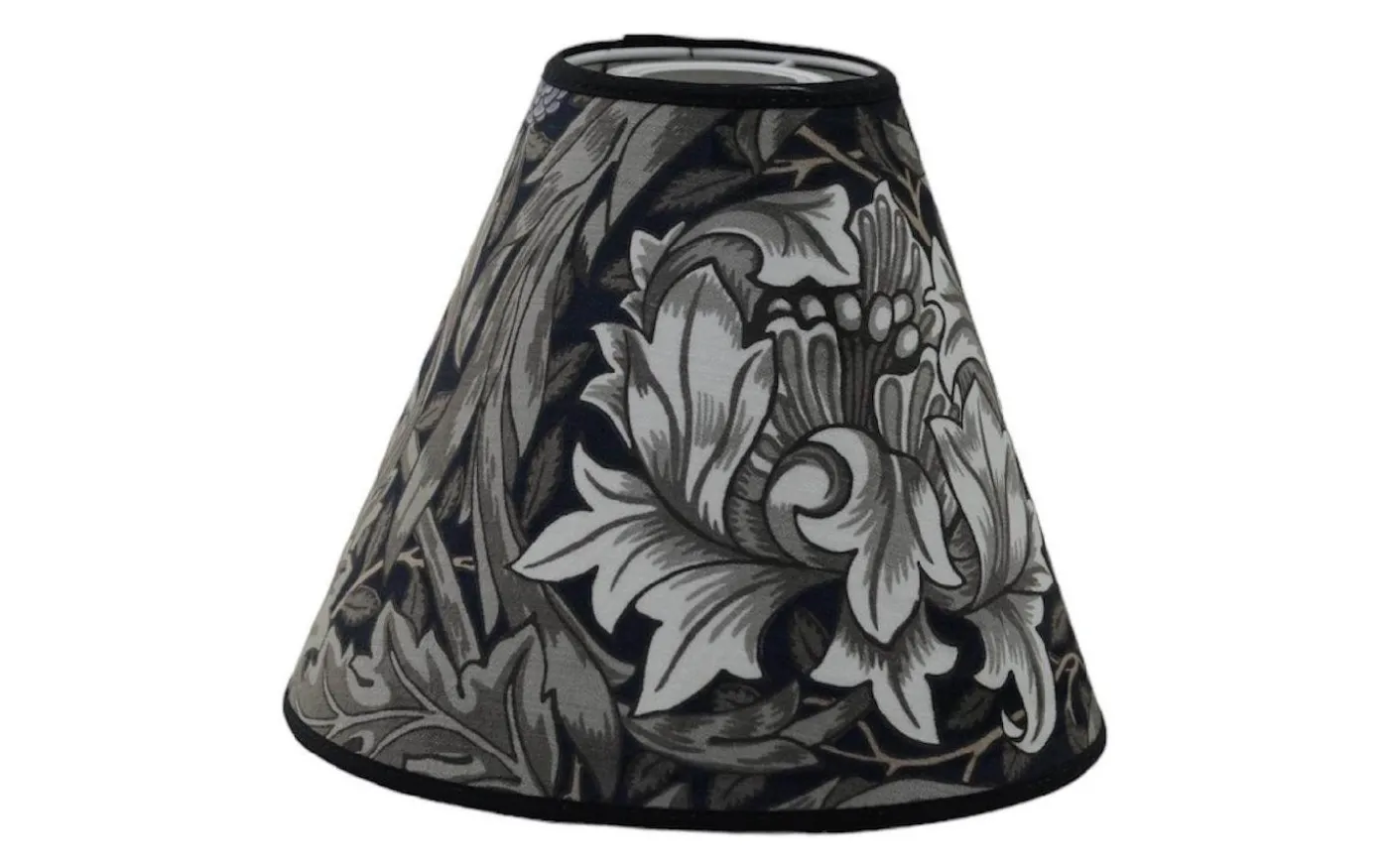 Dramatisk toppringsskärm i sammet med William Morris kraftfulla Africa Marigold-mönster i svartvita toner. Den klassiska toppringen kombinerat med det stora, expressiva blommotiven på lyxig sammet skapar en elegant och striking ljuskälla. Diameter 22 cm. En sofistikerad accent som tillför både dramatik och tidlös brittisk designkänsla till ditt hem.