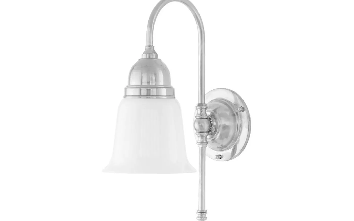 Klassisk väggarmatur för en öppen glasskärm. Placeras lämpligen på var sin sida om en badrumsspegel. Det nedre stagen kan avlägsnas om man vill montera lampan ovanför exempelvis en spegel. För fast montage. För att gå in med kuloledning kompletteras med en distansplatta.