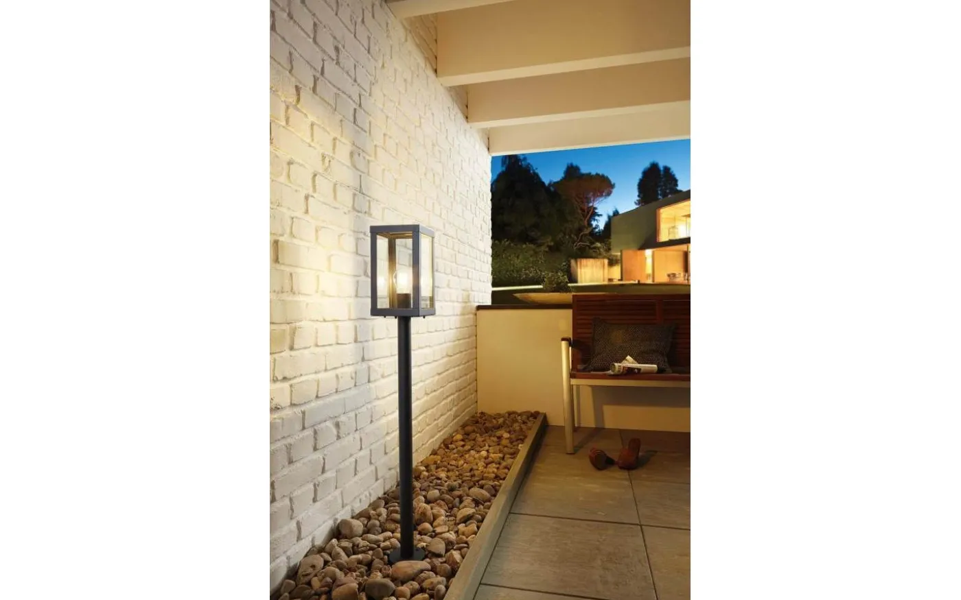 ALAMONTE 1 vägljus har en svart metallstolpe och svart metallram med klara glaspaneler. Panelerna ger en direkt vy av glödlampan inuti. Stolplampan är lämplig för utomhusbruk på grund av dess IP44-skydd mot sprutvatten. Produkten har en modern design som smälter in sömlöst i alla utomhusområden, oavsett om det är i entrén eller trädgården.