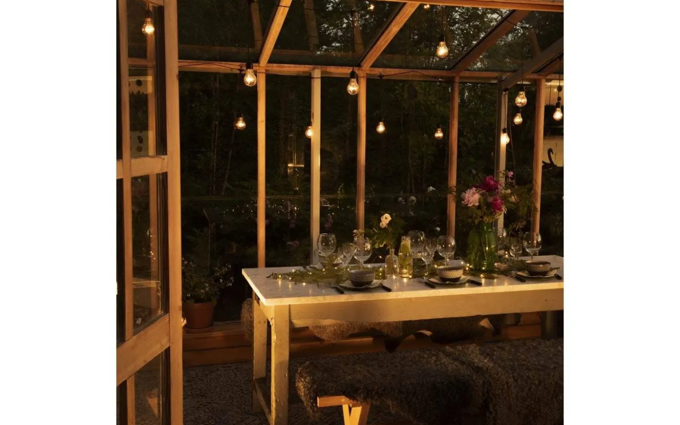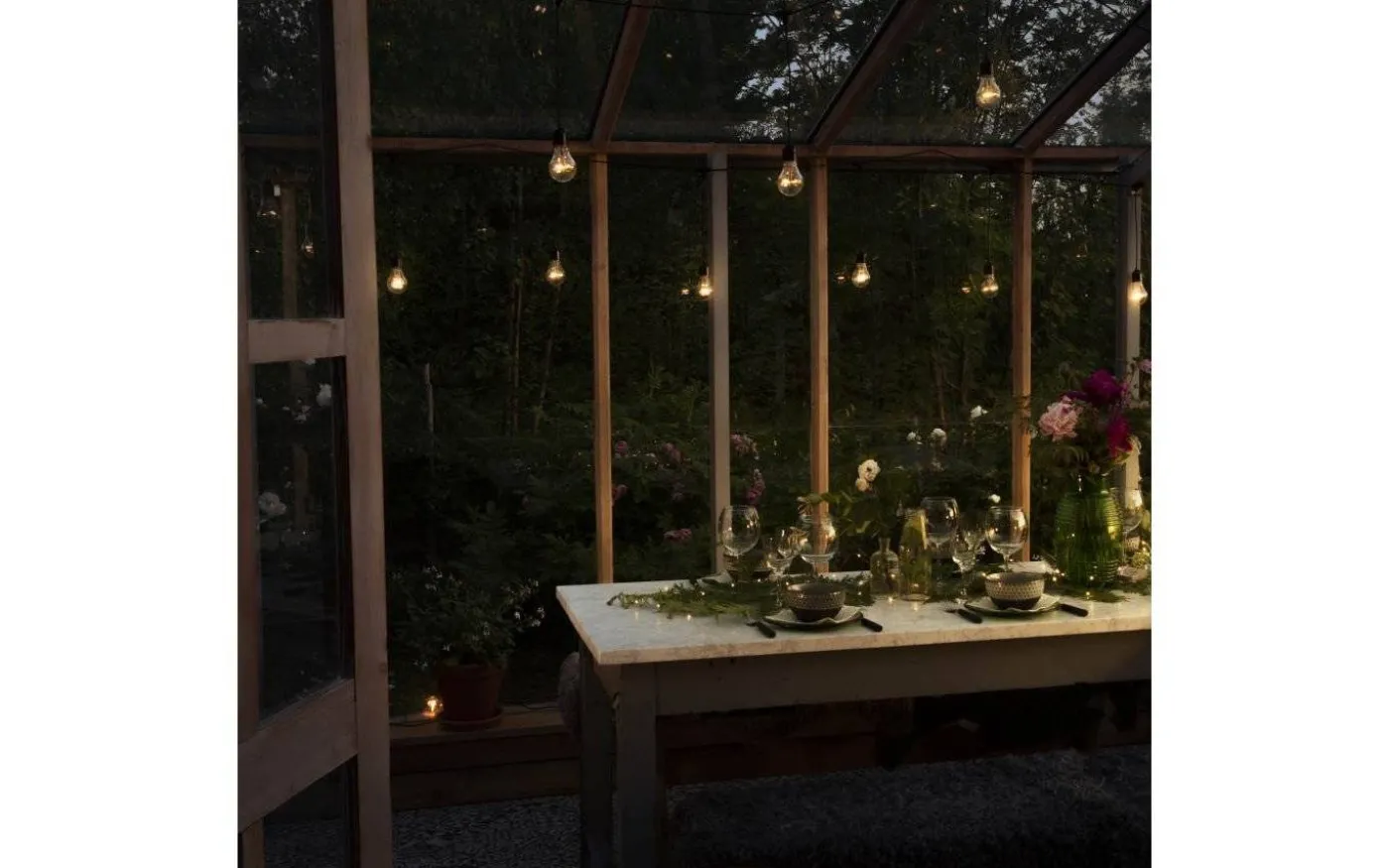 Varje ljuskälla avger ett dekorativt, extra varmvitt ljussken och en ljusstyrka på 16 lumen. Då slingan är dimbar kan du enkelt justera ljusstyrkan stegvis med hjälp av knappen på transformatorn. Med sin IP44-klassning är denna ljusslinga väl anpassad för utomhusbruk men passar precis lika bra som mysbelysning inomhus om så önskas.