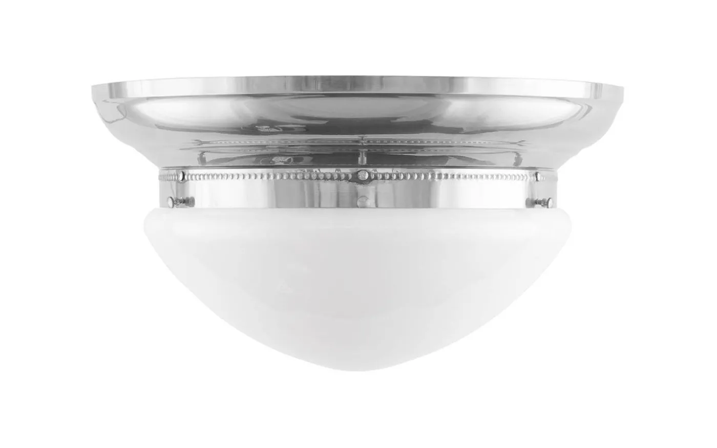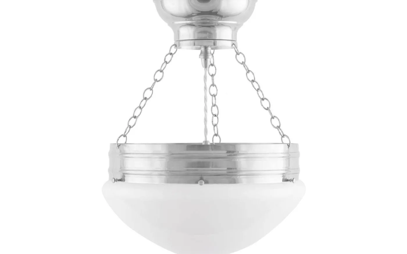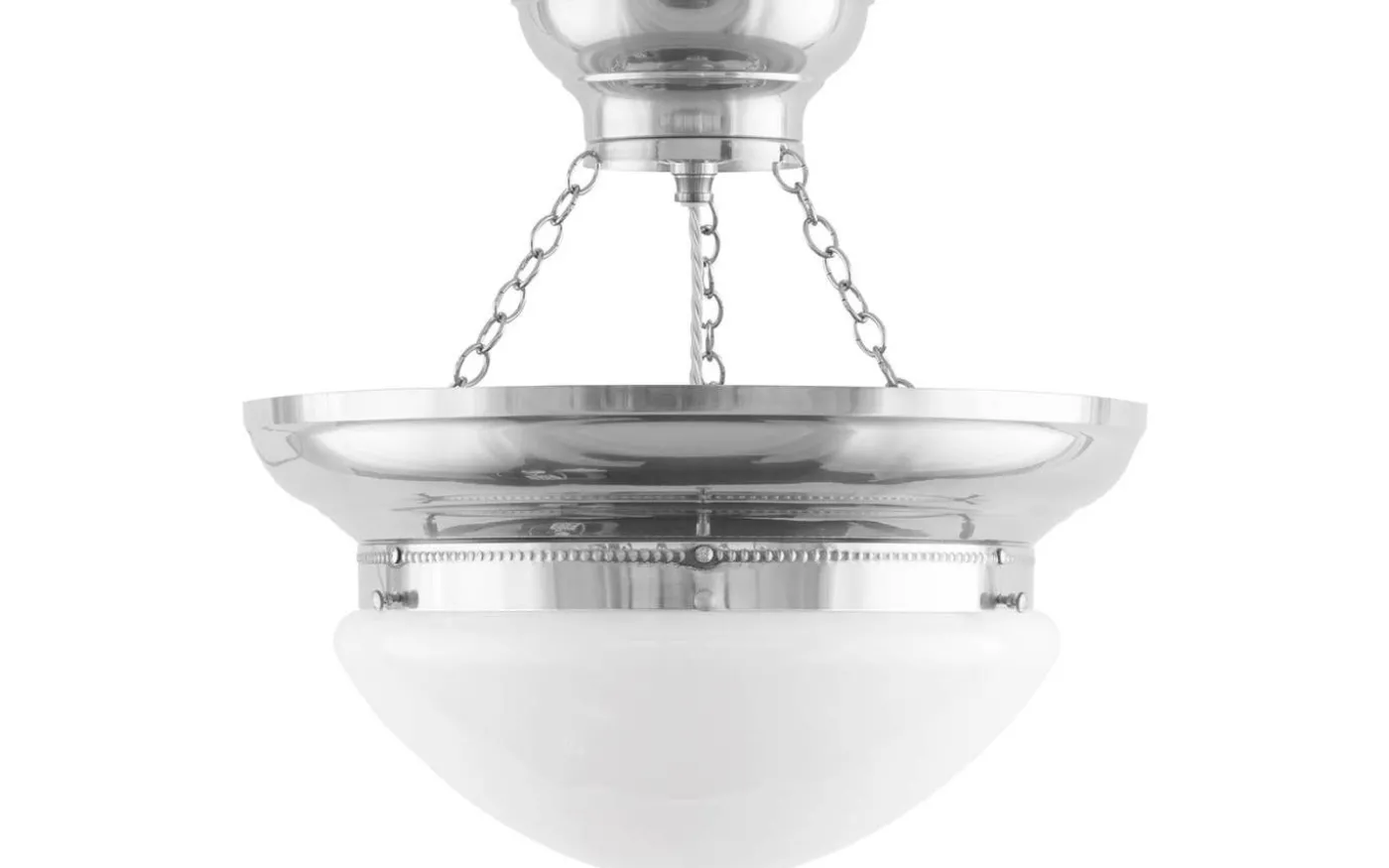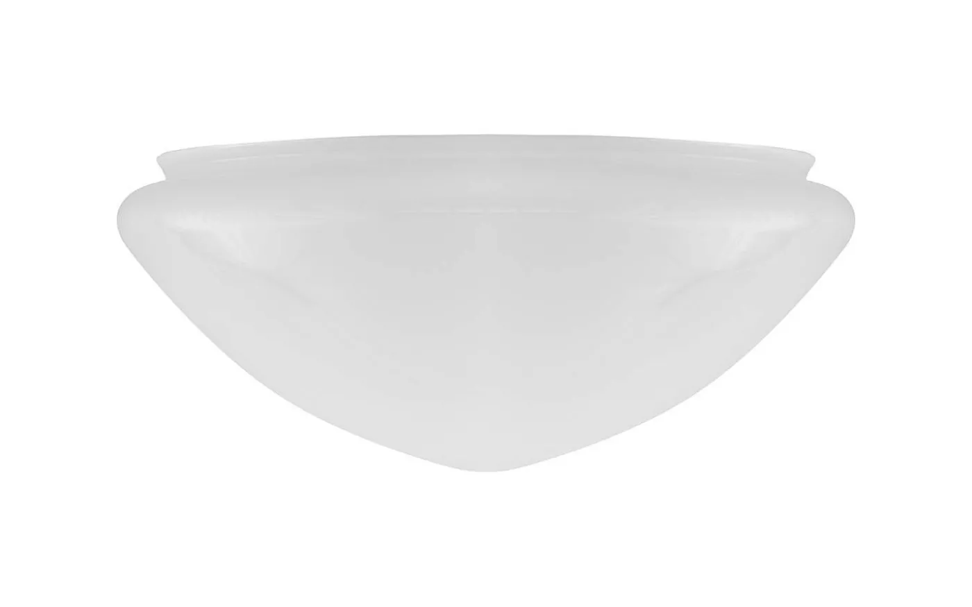 En klassisk droppformad kupa i vitt överfångsglas. Slutna vita kupor blev vanligt förkommande först på 1920-talet – innan dess var det slipat eller matterat klarglas som inte ansågs dämpa glödlampan sken i samma utsträckning.