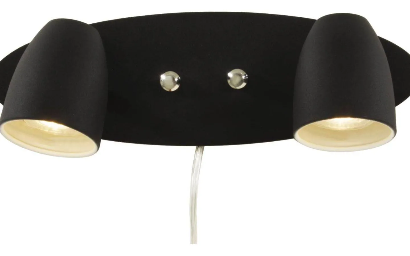 Sandnes vägglampa i svartlackerad metall. Lampan har två justerbara lamphuvuden. Lampan slås på och av med en separat dimmer på lampan. Max 2 x 8W,ingår inte. Ansluts med sladd och stickpropp.
