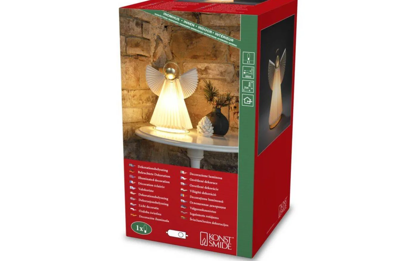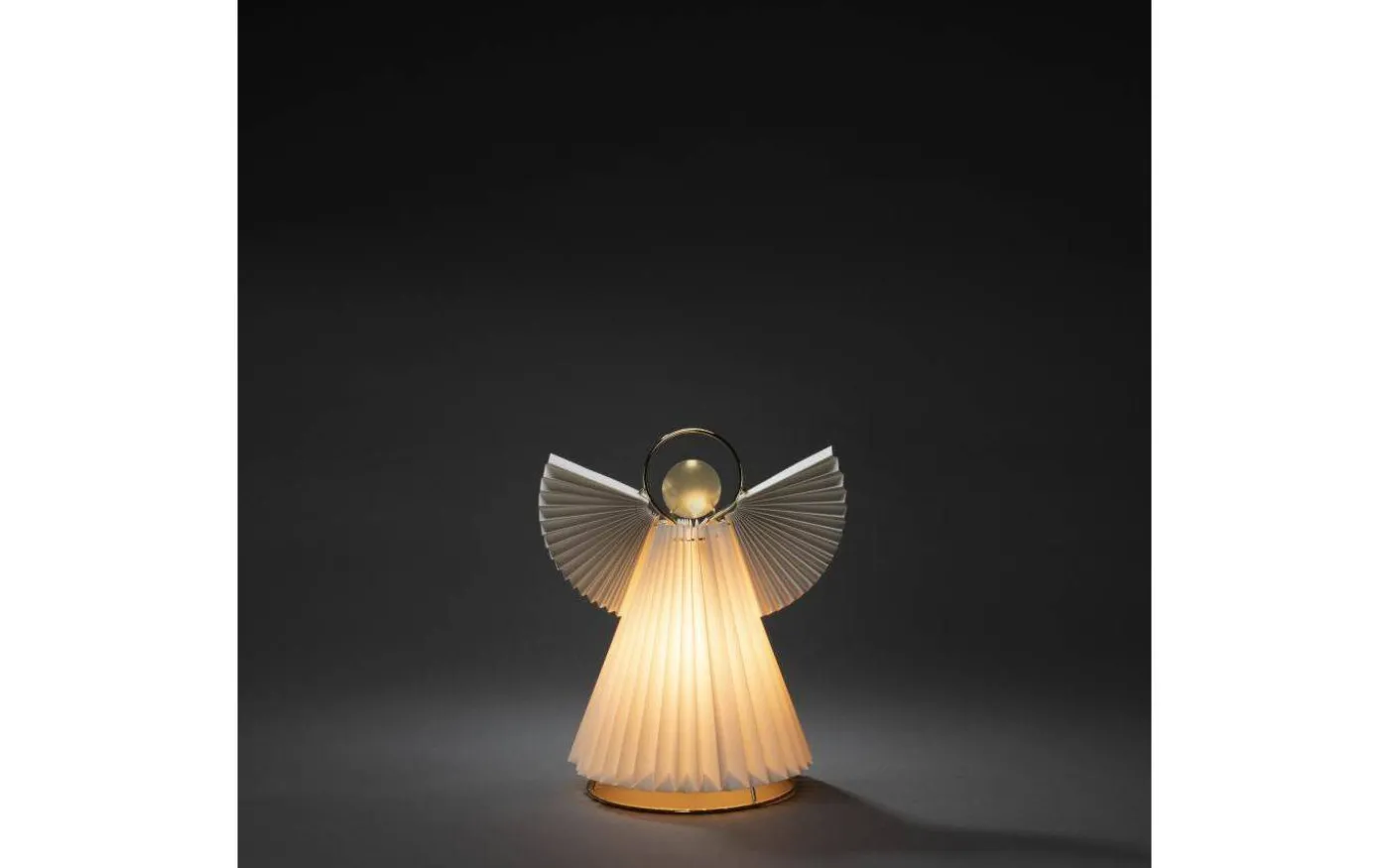 Vackra Angel bordsdekoration från välkända Konstsmide är en vacker ängel i papp som sitter på ett mässingsfärgat stativ med vackra detaljer.