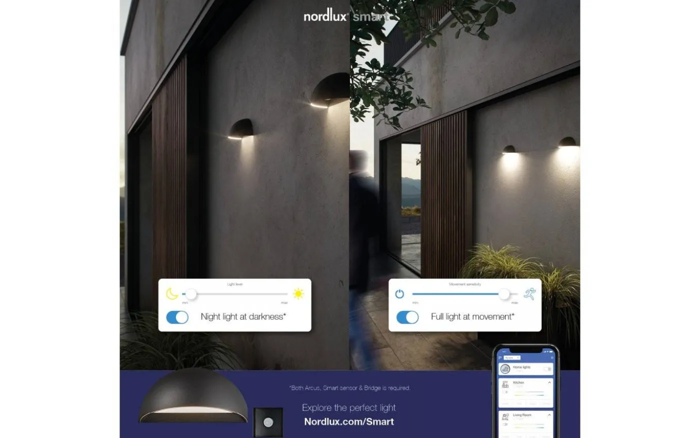 Arcus är en stilren och funktionell vägglampa i grå metall, som ingår i serien Nordlux Smart Light. Att den ingår i serien Smart Light innebär att du enkelt kan justera ljusstyrka samt färgtemperatur via en app i din telefon, läs mer om hur detta fungerar nedan.