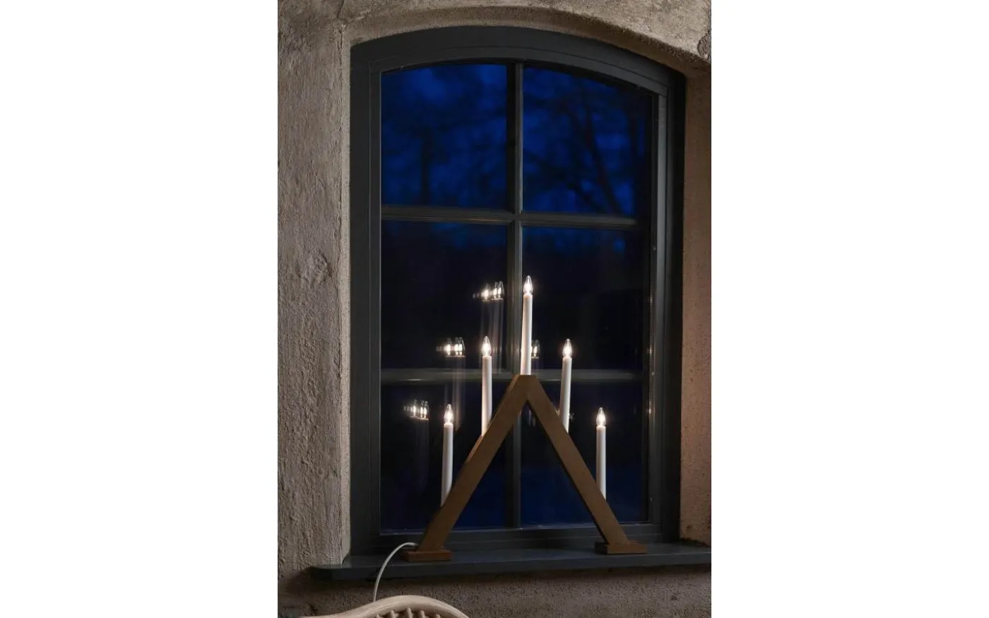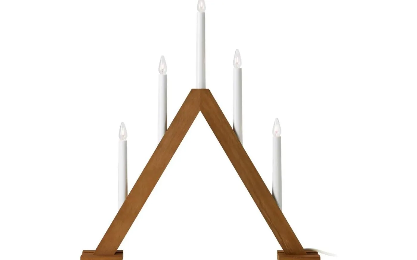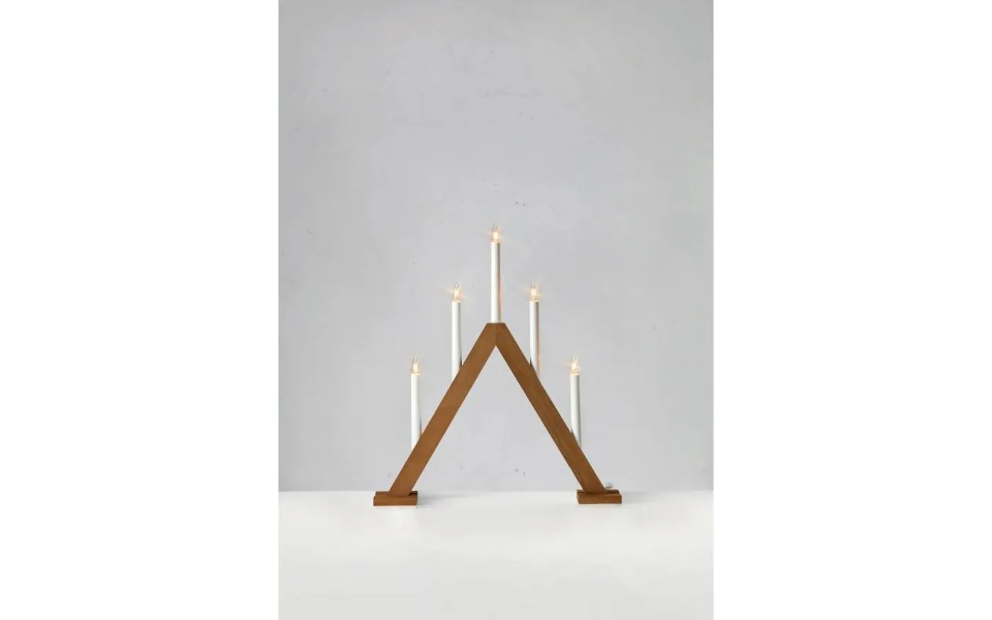 Stilren och klassisk adventsljusstake i ljusbrunt betsat trä med 5 ljuskällor. Placera i ett fönster eller på en sidobänk för att få en mysig känsla i hemmet under julen. Finns i fler storlekar och färgvarianter. Tekniskt : Adventljusstaken kräver 5 ljuskällor med E10 sockel om max 3W, ingår. 2 m vit sladd med strömbrytare och väggkontakt.