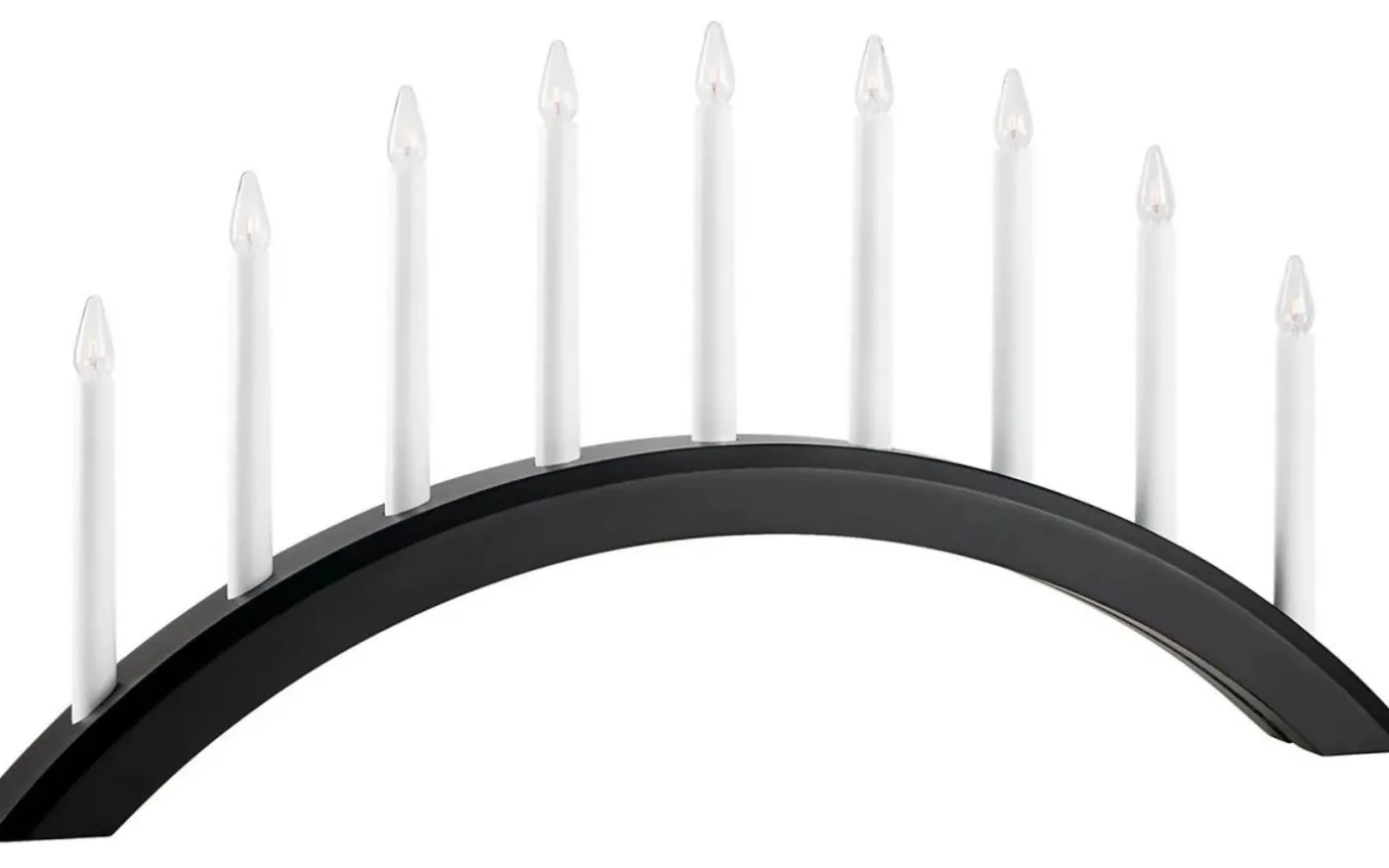 Svart bågformad adventsljusstake med nio ljuskällor. Ljusstaken har en bredd på 67 cm och passar i alla hem. Tekniskt: Ljusstaken kräver nio glödlampor med E10-sockel om max 3W, ingår. 2m lång sladd med strömbrytare.