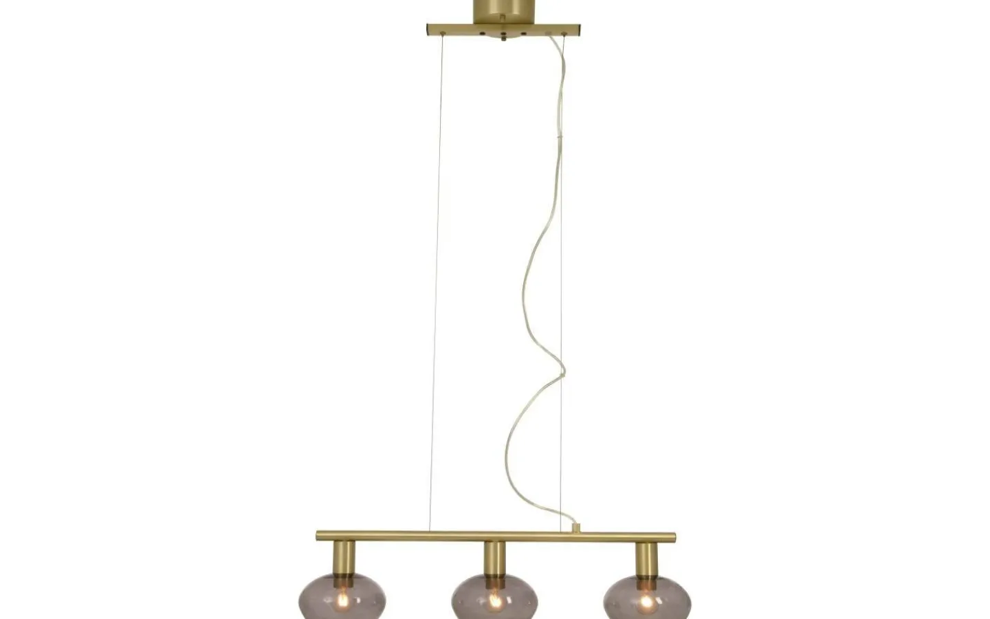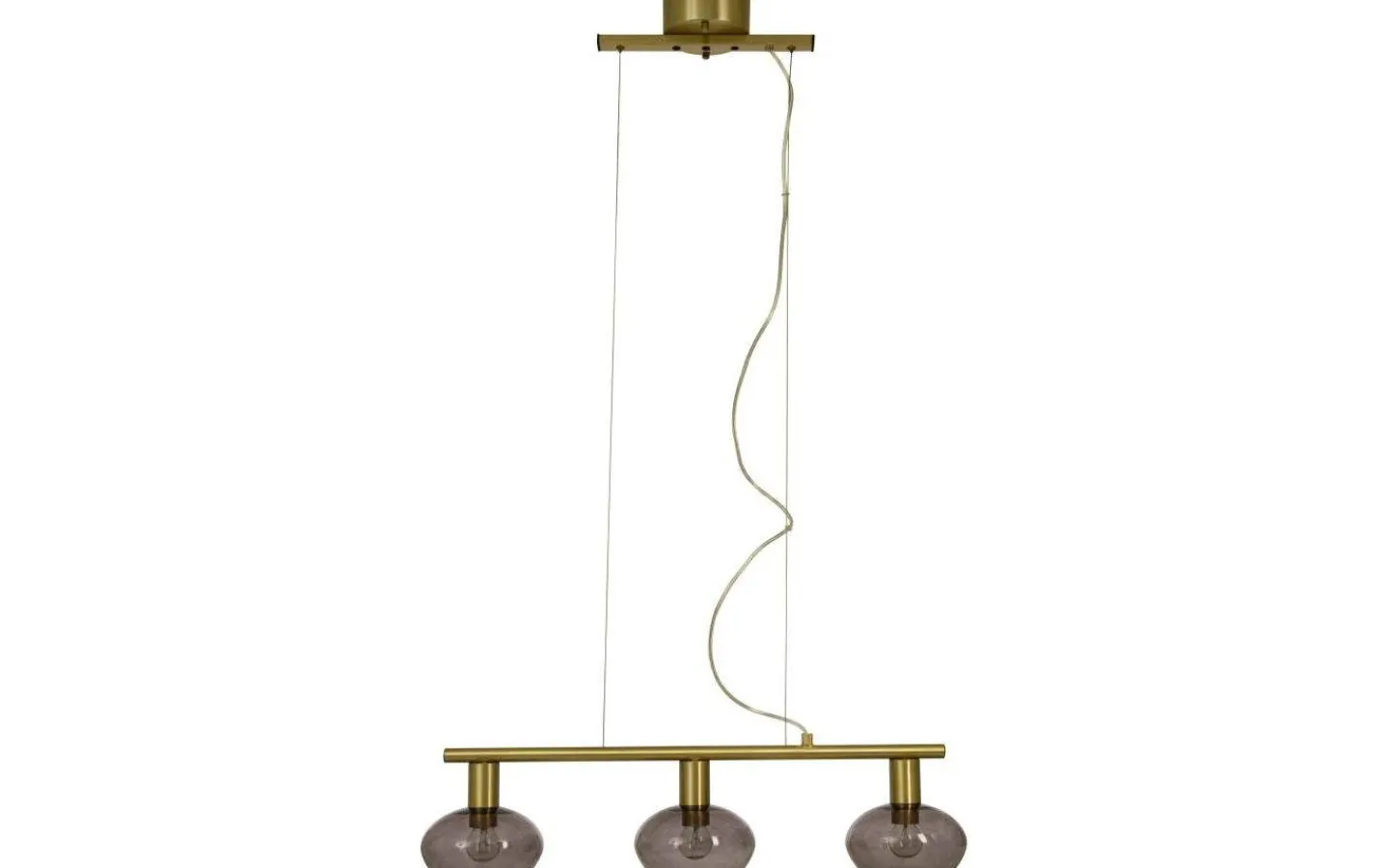 Bell taklampa i matt mässing med rökfärgade glasskärmar i rad. Takkoppen i metall för kronkontakt med kopplingsplint, lamppropp kan monteras. Max 3x30W E14, ingår ej. Lampan kan justeras till önskad höjd.