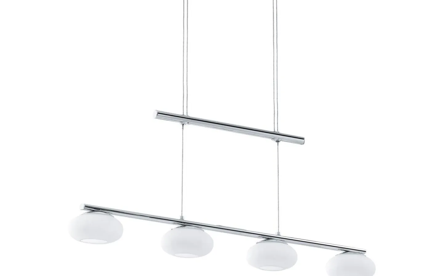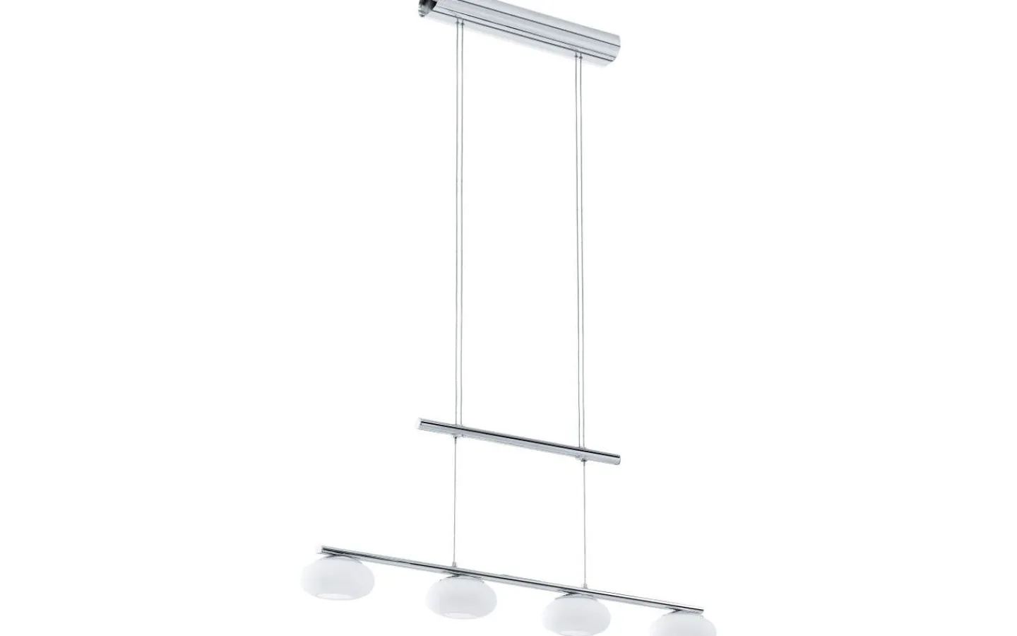 Pendellampan ALEANDRO 1 har ett kromfärgat takfäste i metall med fyra runda lampskärmar gjorda av matt opalglas i vitt. De integrerade lysdioderna ger ett behagligt varmvitt ljus och kan dimmas med en koordinerande roterande dimmer på väggen. Pendellampan är justerbar i höjdled och kompletterar perfekt moderna interiörer och ger perfekt belysning för ett långt matsalsbord.