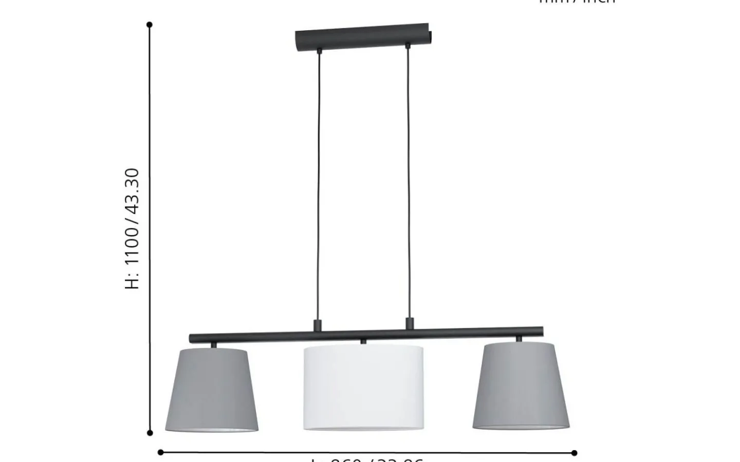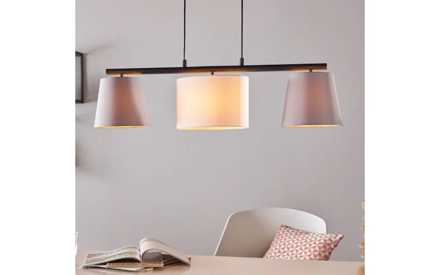 Pendellampan ALMEIDA 1 har ett metalltak i svart försett med ett avlångt, hängande metallfäste i samma färg och tre tygskärmar. De tre nyanserna – två i grått och en i vitt – skapar ett attraktivt, välbalanserat utseende, förstärkt av deras koniska och ovala konturer. Pendellampan har en retro-chic look i 60-talsstil och smälter sömlöst in i moderna interiörer och ger mysig belysning i vardagsrummet eller över ett långbord i matsalen.