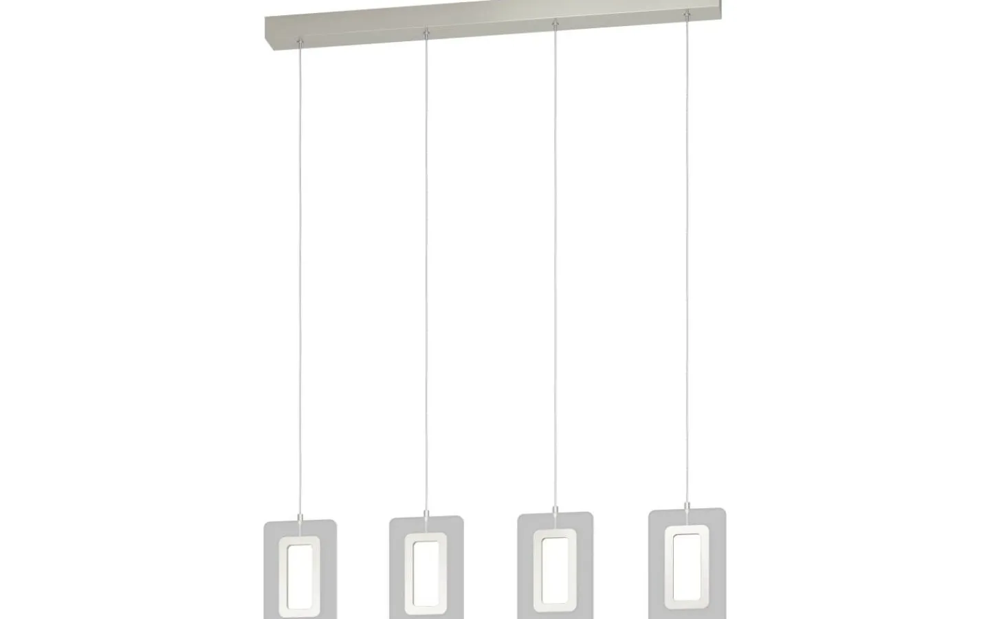 ENALURI LED-pendellampa har fyra platta akrylstrukturer som var och en omger ett matt nickelmetallelement. De integrerade lysdioderna ger ett behagligt varmvitt ljus. Med sitt skärmtak i matt nickel smälter den minimalistiska taklampan sömlöst in i moderna interiörer, och tack vare sin klassiska design fungerar den perfekt i alla utrymmen, oavsett om det är i vardagsrummet eller över ett långbord i matsalen.