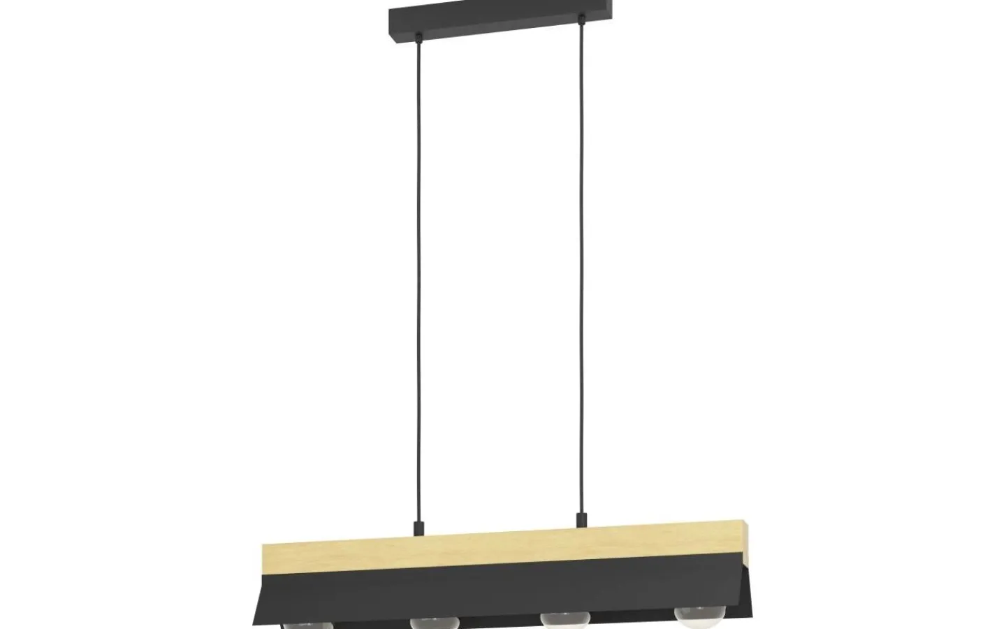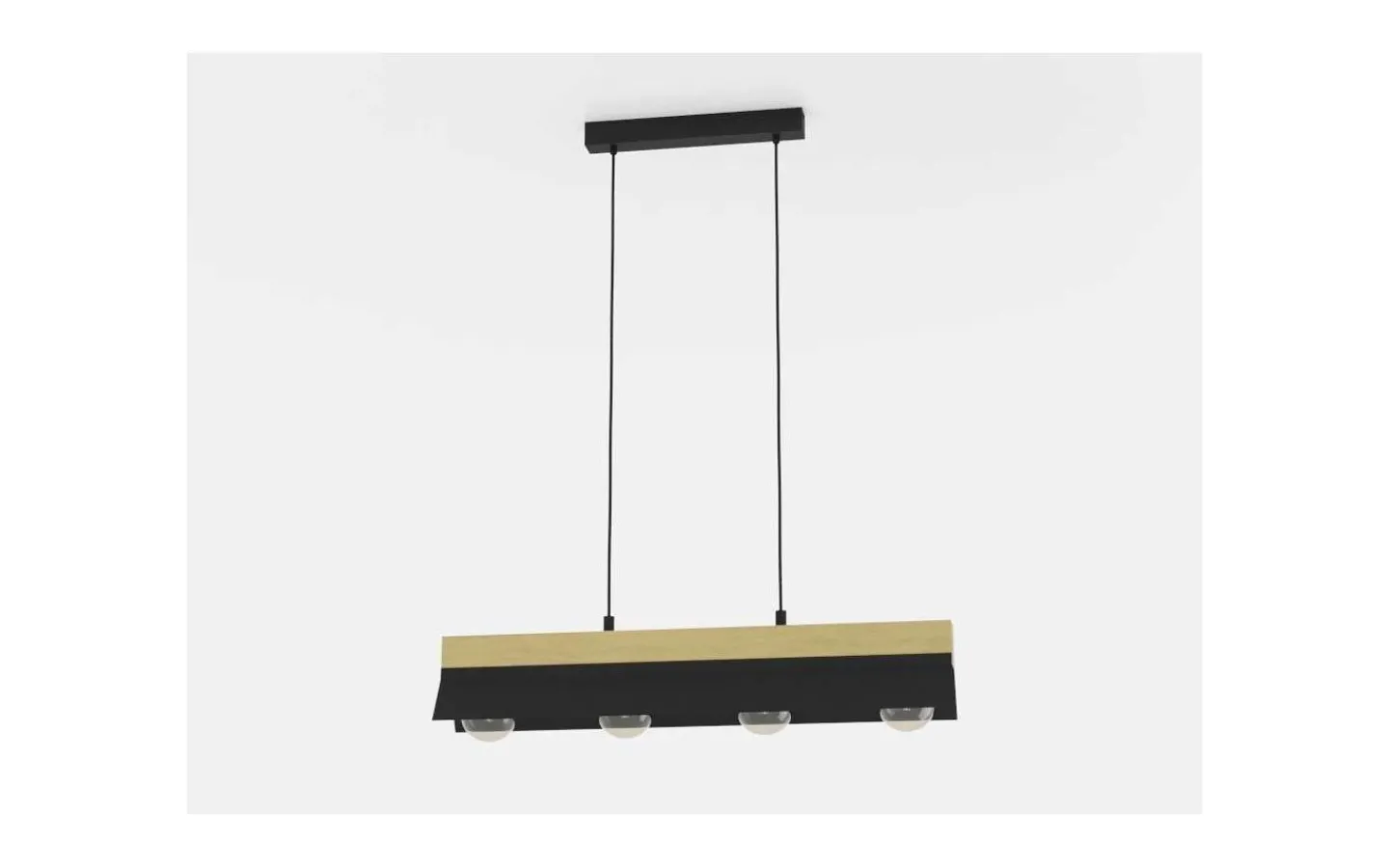 Tarrafo Taklampa, 88 cm i bredd, kombinerar modern design med naturliga element. Den rektangulära svarta ramen kontrasterar vackert mot det naturliga träfärgade inlägget, och de fyra ljuskällorna ger ett riktat ljus för en fokuserad belysning i ditt rum.