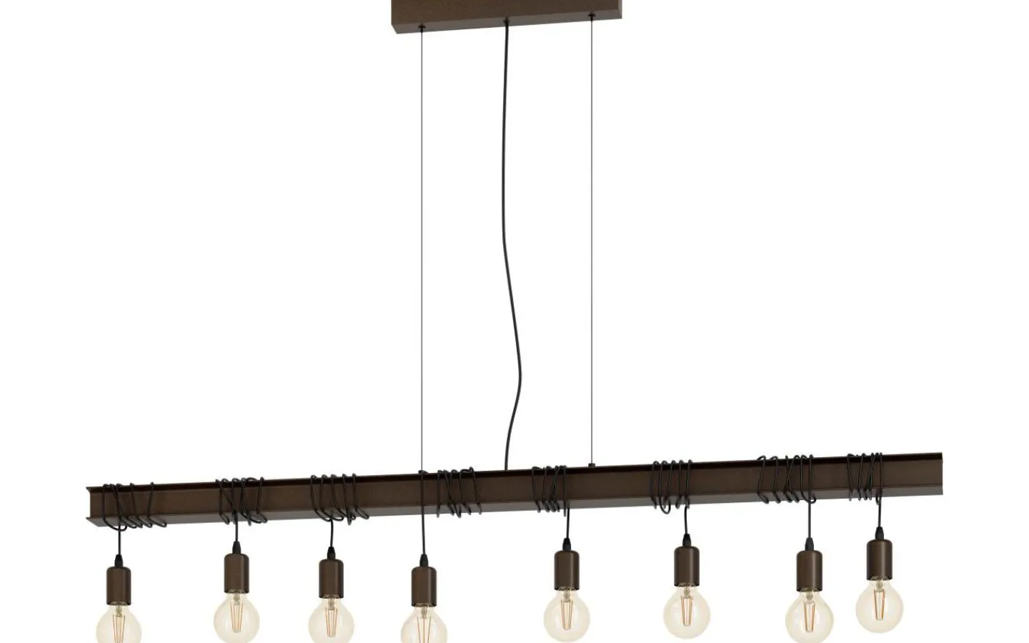 Pendellampan TOWNSHEND 4 har en antikbrun metallbalk och åtta antikbruna lamphållare. Lamphållarna är upphängda i olika höjder och kan bytas genom att linda eller varva upp repen. Med sitt industriella utseende kompletterar taklampan moderna interiörer och ger distinkt belysning för alla utrymmen, oavsett om det är i vardagsrummet eller över ett långbord i matsalen.