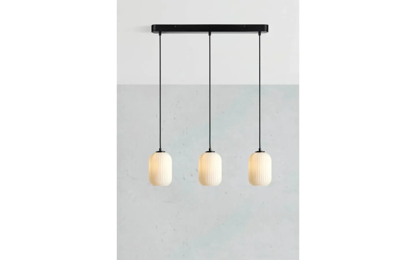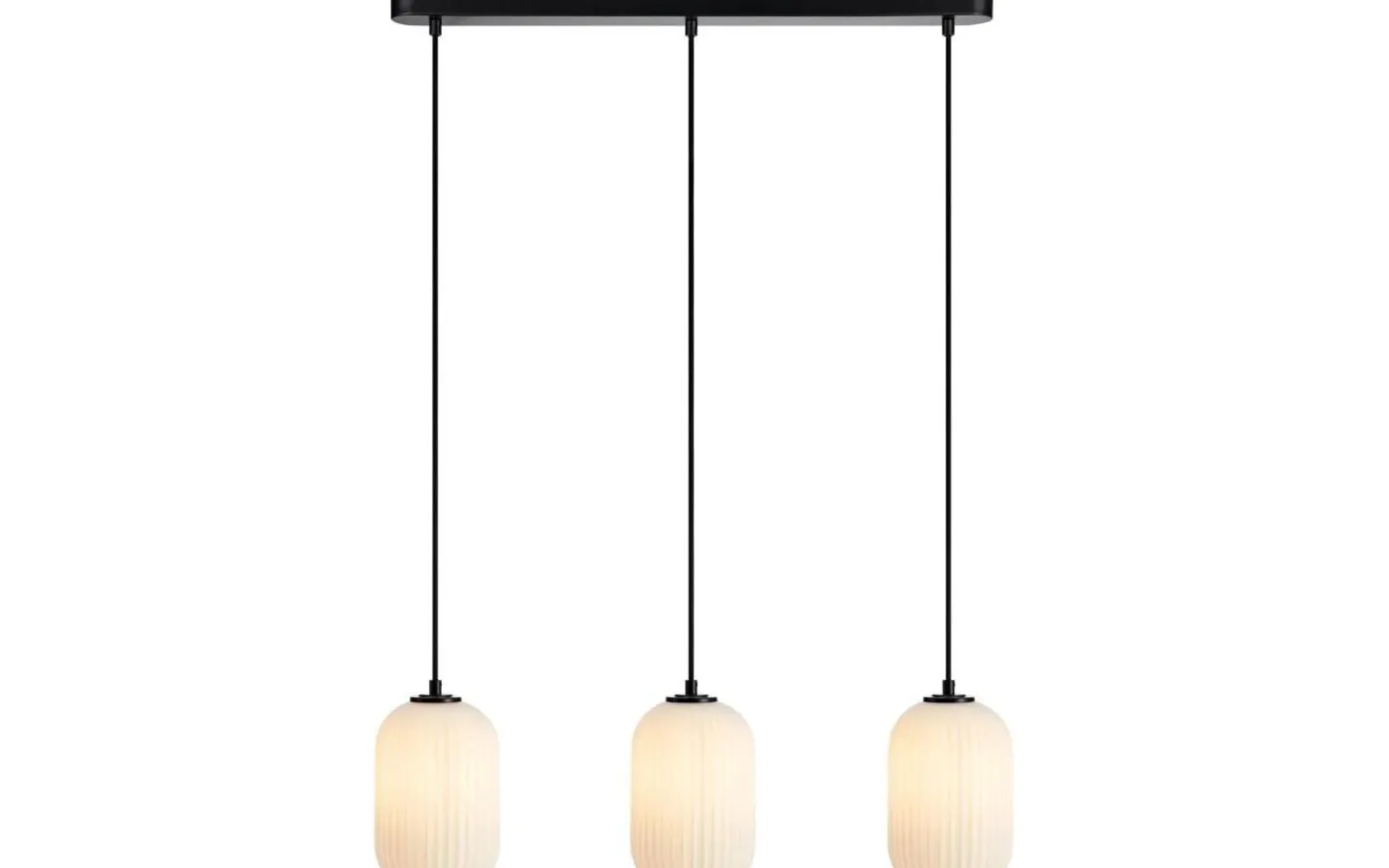 Fina Cava taklampa från välkända Markslöjd är en stilren taklampa i svart metall med 3st nedpendlade kupor i räfflat, opalvitt glas. Lamphusen hänger i 1,5m långa svarta textilsladdar som kan justeras i höjdled.