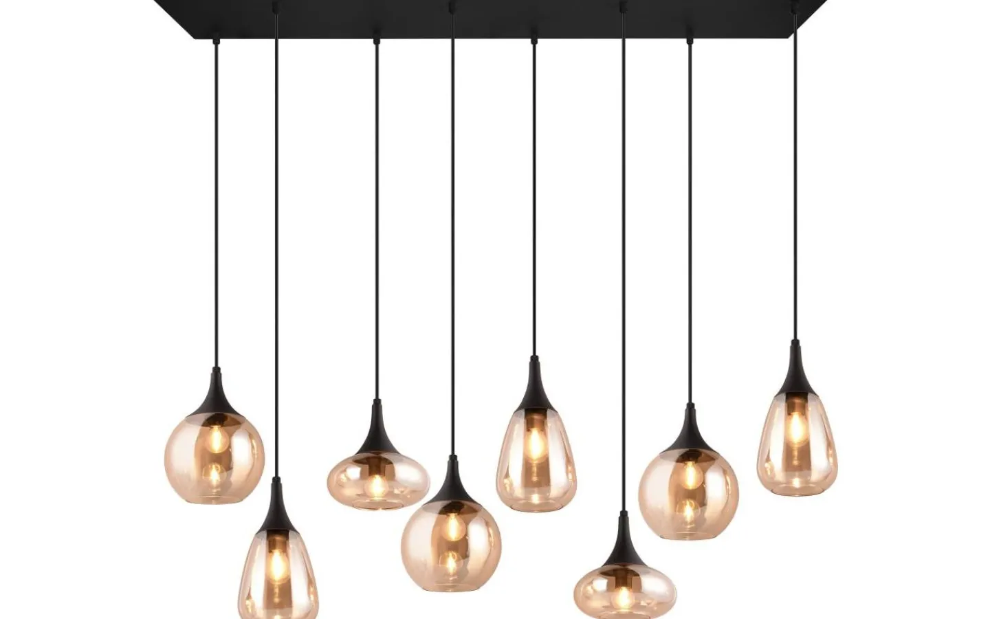 LUMINA pendellampa är ett särskilt blickfång i ditt vardagsrum tack vare sina eleganta glasskärmar! De tre skärmens olika former och sammansättningen av metall och glas skapar en vacker och unik ljusatmosfär som ger din matplats en modern touch. Tack vare det mattsvarta färgschemat och de bärnstensfärgade glasskärmarna finns det gott om utrymme för andra färger, vilket gör den underbart enkel att integrera i befintliga boendekoncept. För modern och pålitlig belysning rekommenderas användning av en LED-lampa. Den erbjuder hög ljuskvalitet, är mångsidig och övertygar med jämn belysning. Dess långa livslängd och låga värmeutveckling gör den till det perfekta valet för en mängd olika användningsområden. Ljuskälla: exklusiv 8x E14 · max. 40W. Extra information: Justerbar i höjd, Takmontering, IP20, Lampa(or) ingår ej