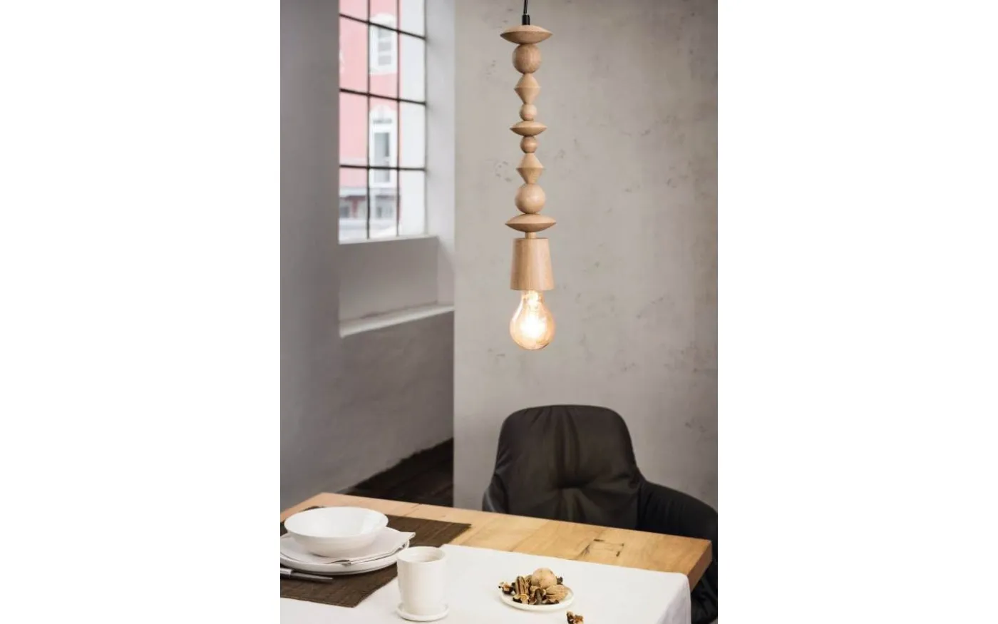 Denna nedpendlade armatur från serien AVOLTRI är gjord av trä i ek.