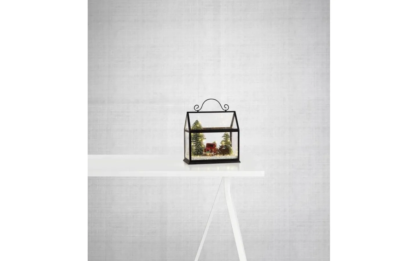 Juldekoration i form av ett hus med batteridrift. Ljushuset har väggar av glas och juliga dekorationer inuti, såsom granar och en bil. Inuti finns 60 st LED-ljuskällor som lyser upp juldekorationen. Höjd på 25 cm. Tekniskt: Juldekorationen har 60 st fasta LED-dioder med varmvitt ljus. Drivs av batteri 3xAAA, ingår ej.