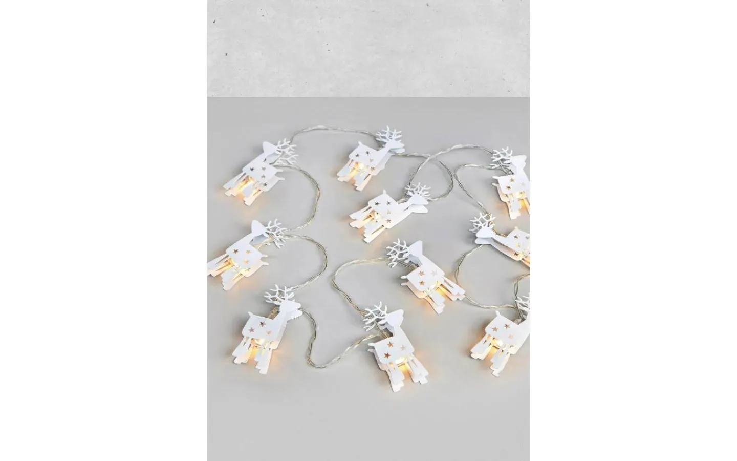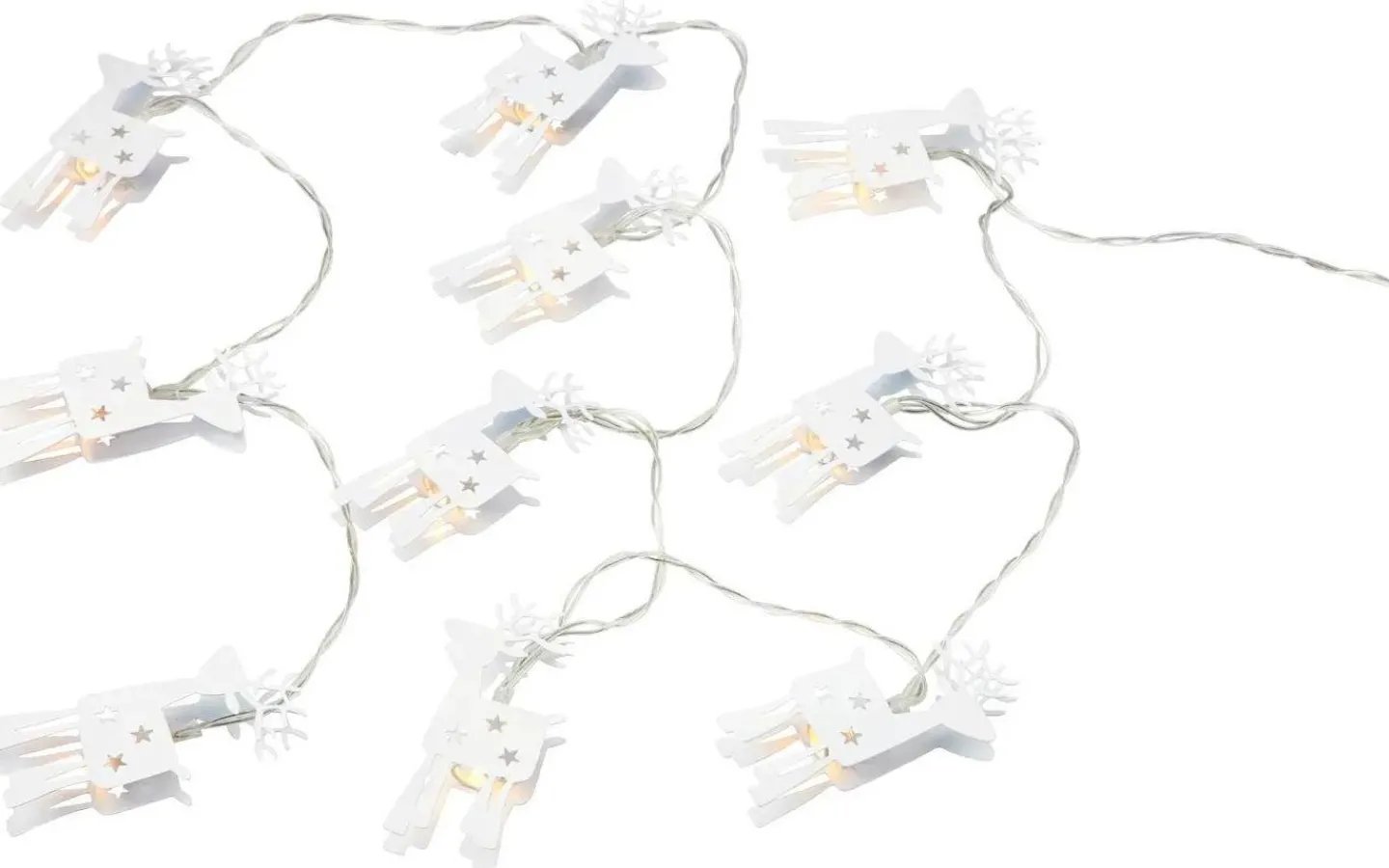 Batteridriven ljusslinga med 10 renar i vit plast. Varje ren har en LED-diod med varmvitt sken. Festlig ljusslinga att använda som dekoration under julen. Slingan är 135 cm lång. Tekniskt: Ljusslinga har fast LED om 0,06W och drivs av 2xAA, ingår ej.