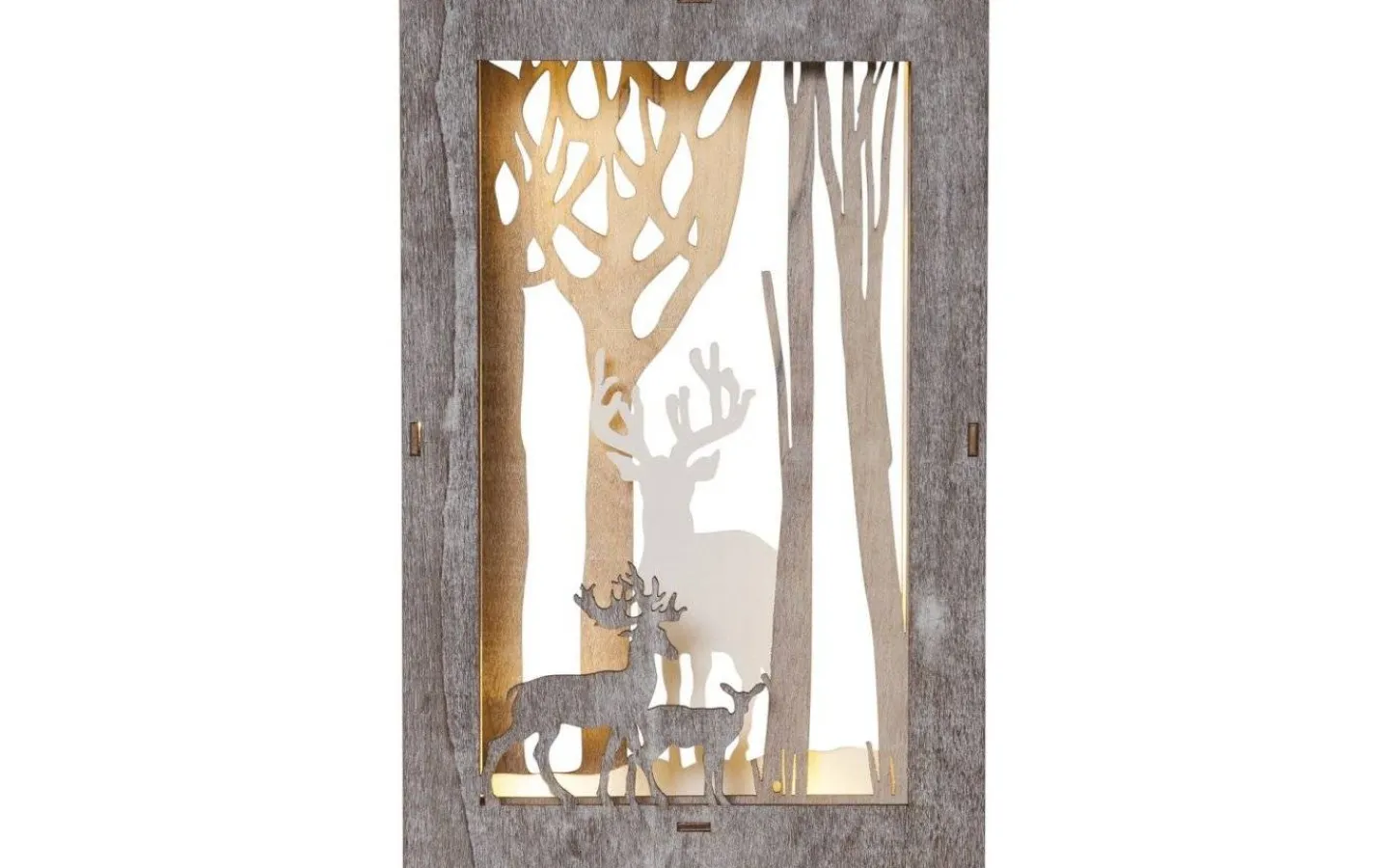 En batteridriven bordsdekoration med renar som har 10 st LED-lampor som ej är utbytbara och lyser med ett varmvitt sken.