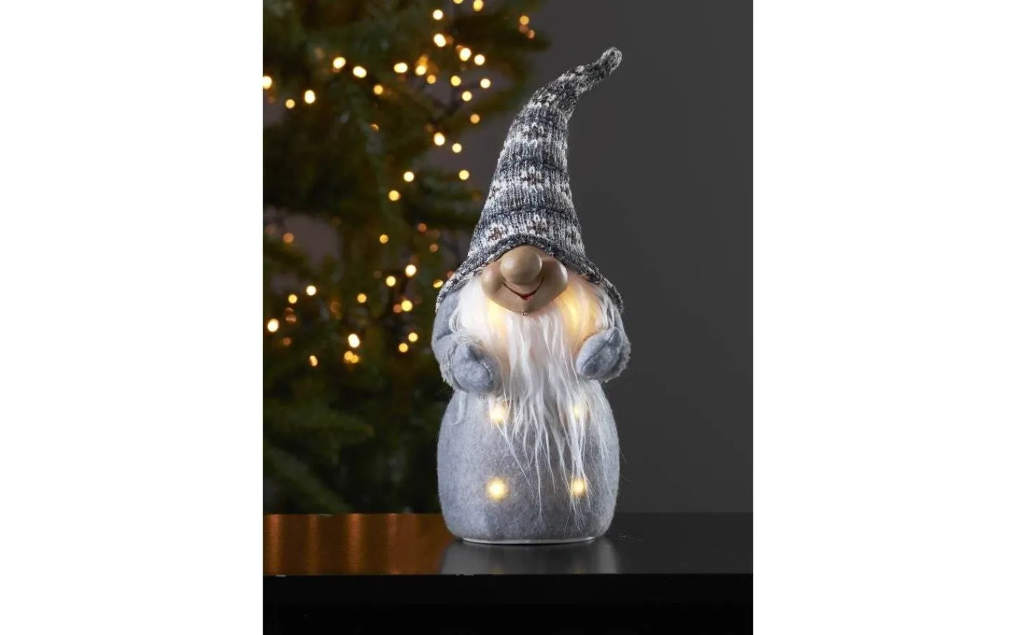 Att ha några dekorationtomtar hemma vid jul är ju ett måste! Och denna urgulliga tomte med gråa vantar, mönstrade luva och ett leende på läpparna ger den ultimata julkänslan. Inne i tomtens kropp sitter 6 stycken ljuskällor som lyser i ett fint sken. Uppskattad batteritid är ca 200 timmar.