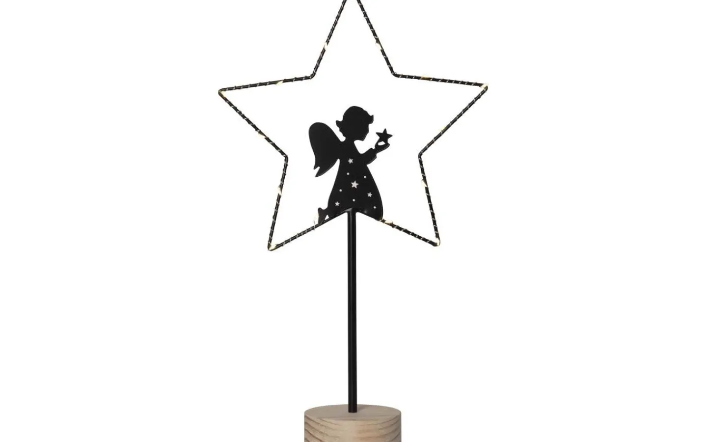 Lysande trådstjärna med dekorativ ängelsiluett. Basen är gjord av obehandlat trä.Ljuspunkter, LED ,lyser vackert runt stjärnan.Placera i ett fönster eller på en skänk för en trevlig julkänsla 2 batterier AA ingår ej. Batteritid ca. 100h.