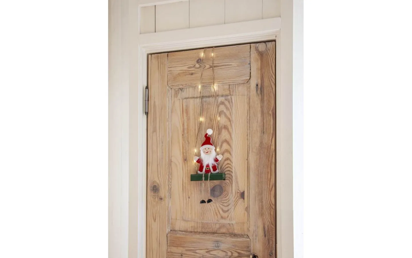 Batteridriven tomte som gungar. Tillverkad i trä. Lyser fint med LED lampor som är virande runt gungans rep. Lättplacerad dekoration som kan hängas i tex en dörröppning, fönster eller kanske dörrhandtaget. 2 batterier CR2032 ingår.