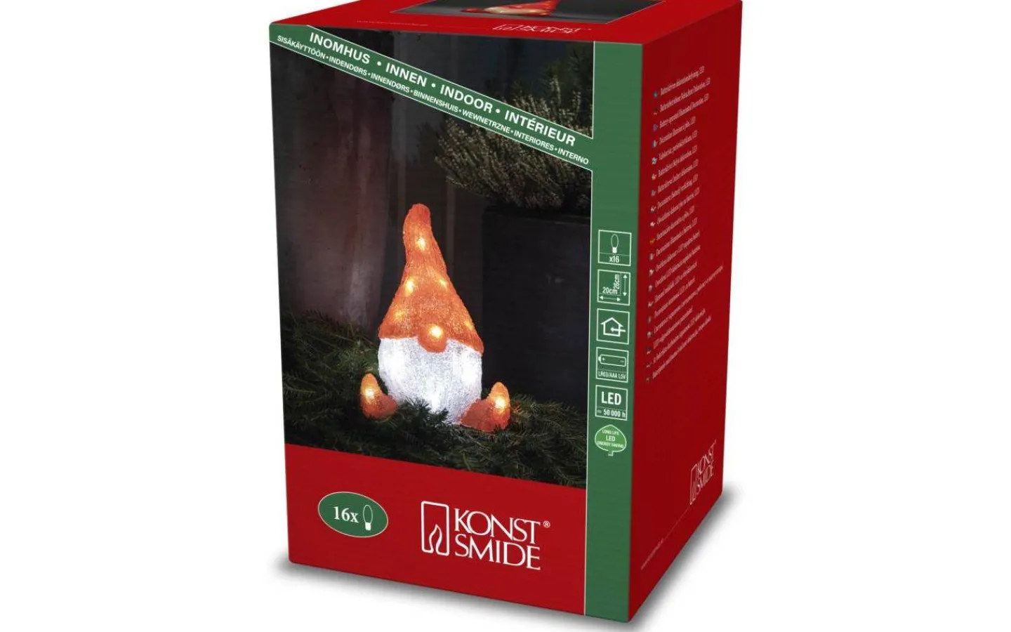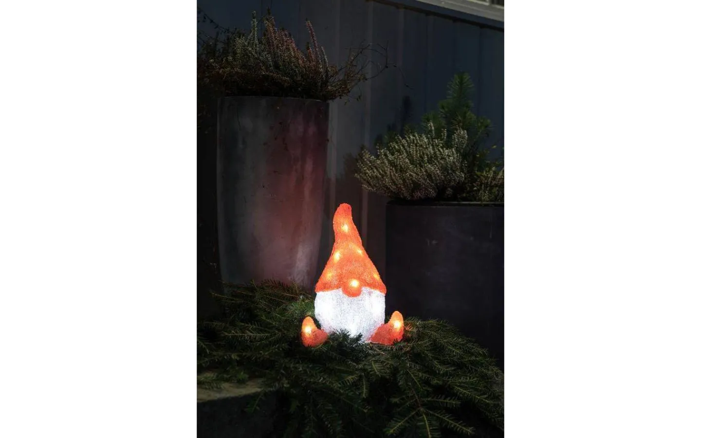 Söt liten batteridriven tomte i akryl från Konstsmide för inomhusbruk. Tomten har 16st små LED-lampor som lyser i ett härligt varmvitt ljussken.