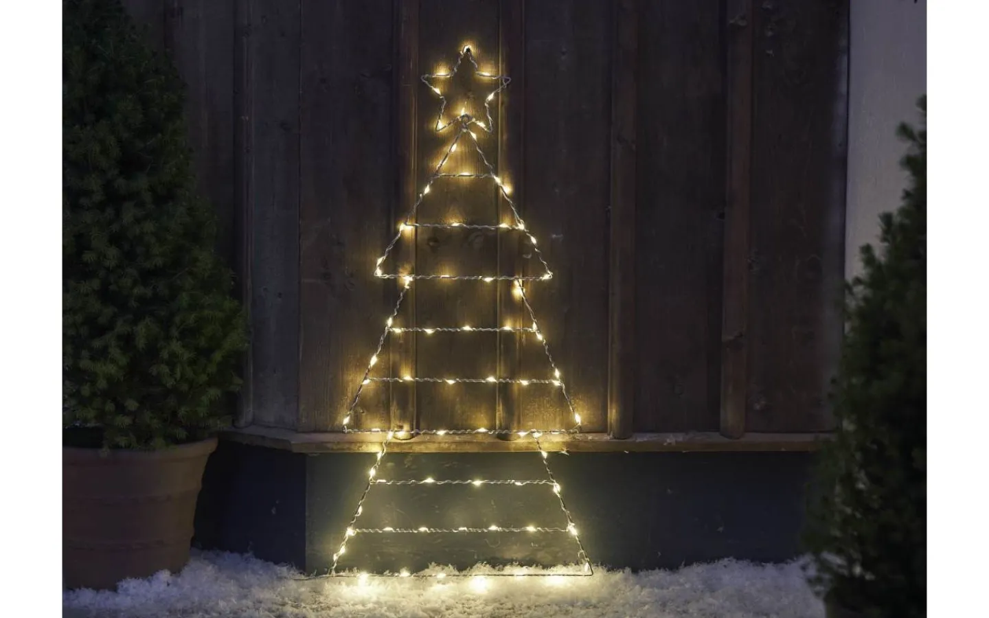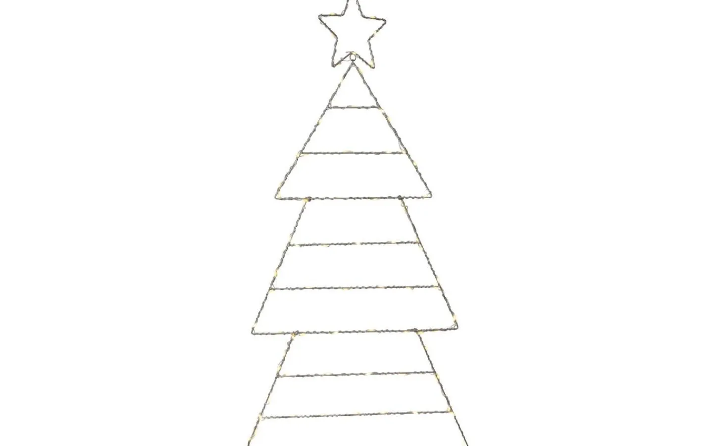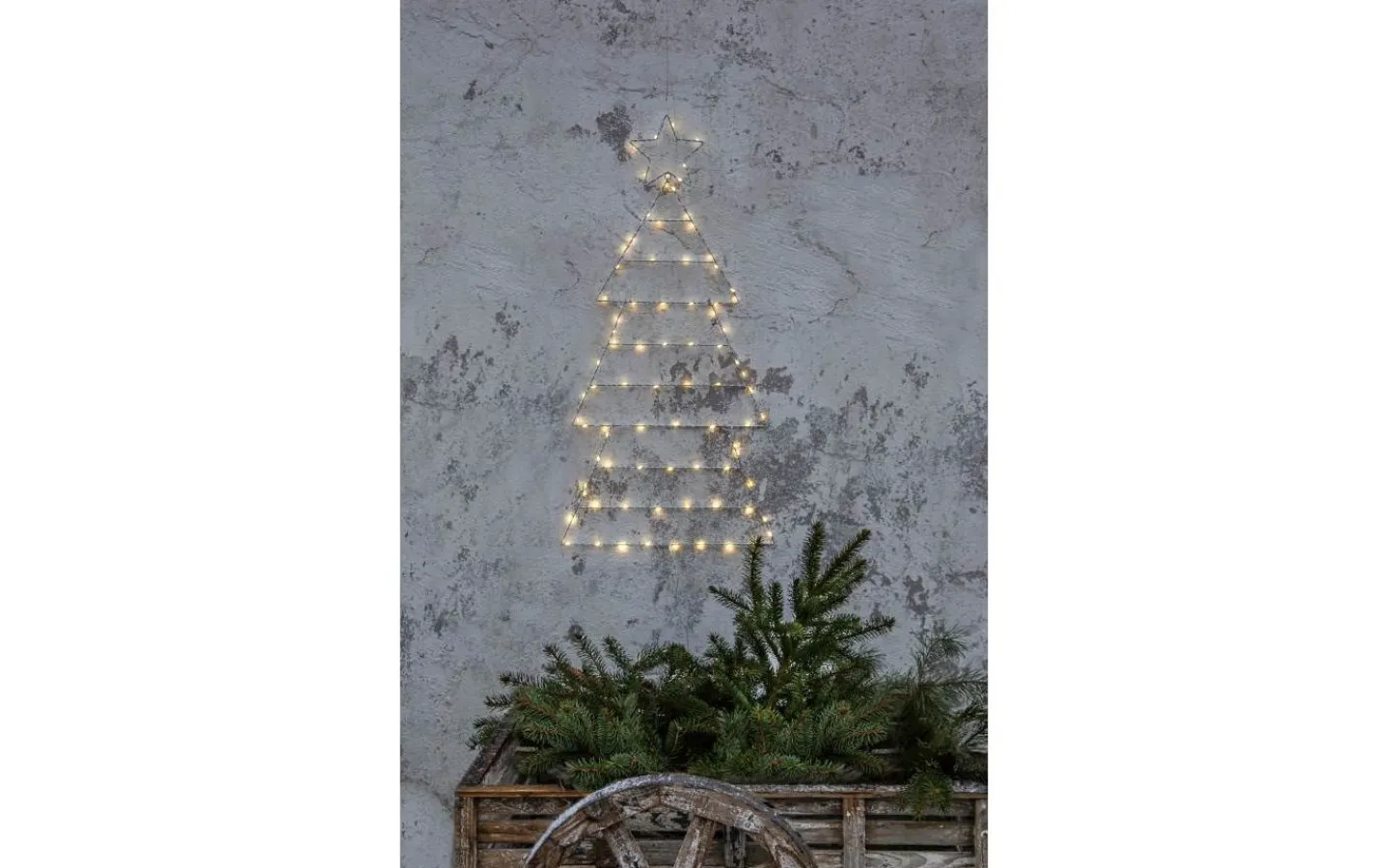 Stilfull siluett i silverfärgad metall för både inom- och utomhus. Siluetten som är i form av en gran är vikbar, vilket ger enkel förvaring som tar liten plats. Fnns i två storlekar, 90 cm med 100 LED och 120 cm med 120 LED. Batteridriven med timerfunktion. Ett buntband medföljer för att säkra stjärnan. 3 batterier AA ingår ej. Batteritid ca. 80h.