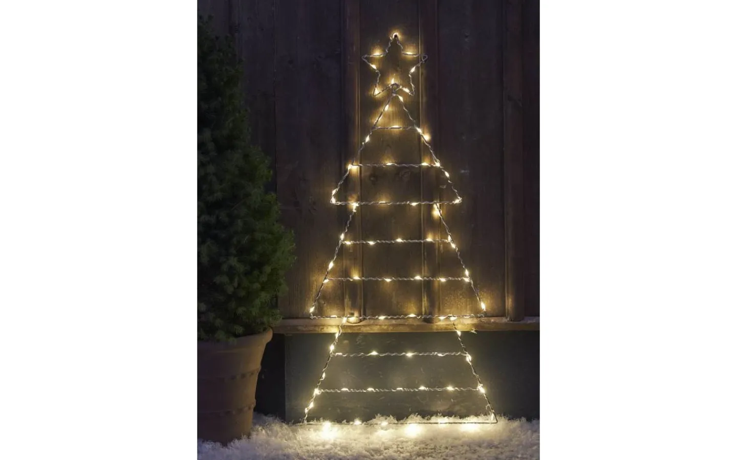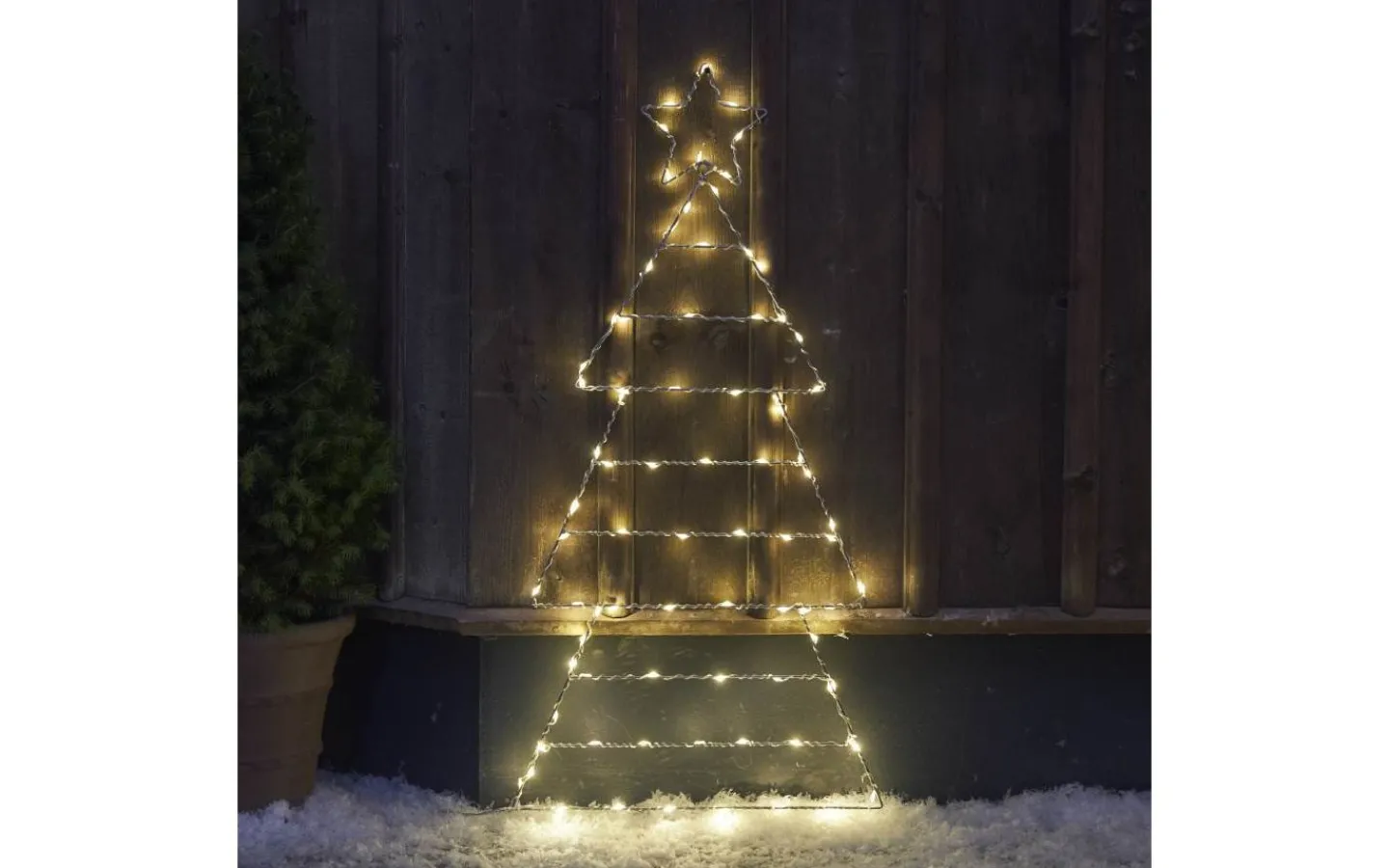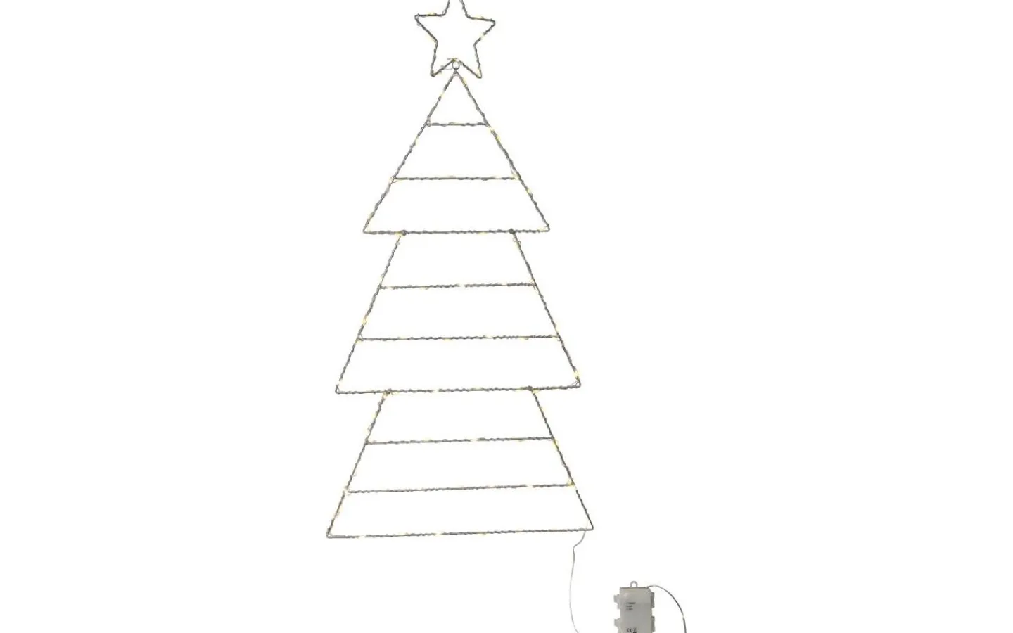 Stilfull siluett i silverfärgad metall för både inom- och utomhus. Siluetten som är i form av en gran är vikbar, vilket ger enkel förvaring som tar liten plats. Fnns i två storlekar, 90 cm med 100 LED och 120 cm med 120 LED. Batteridriven med timerfunktion. Ett buntband medföljer för att säkra stjärnan. 3 batterier AA ingår ej. Batteritid ca. 80h.