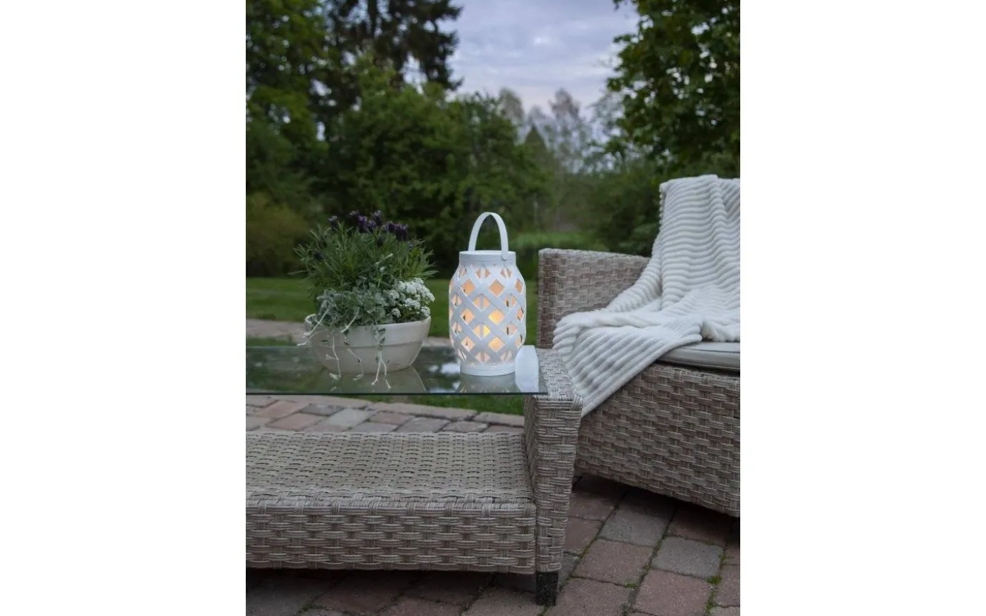 Flame Lantern är en härlig batteridriven lykta i vitt, från Star Trading. Lyktan har inbyggd timerfunktion där du tänder den en gång vid önskad tidpunkt och lyser sedan i 6 timmar och tänds igen automatiskt samma tidpunkt dagen efter. Lyktans inbyggda ljus lyser likt en flammande fackla och hjälper dig skapa en härlig stämning på uteplatsen.