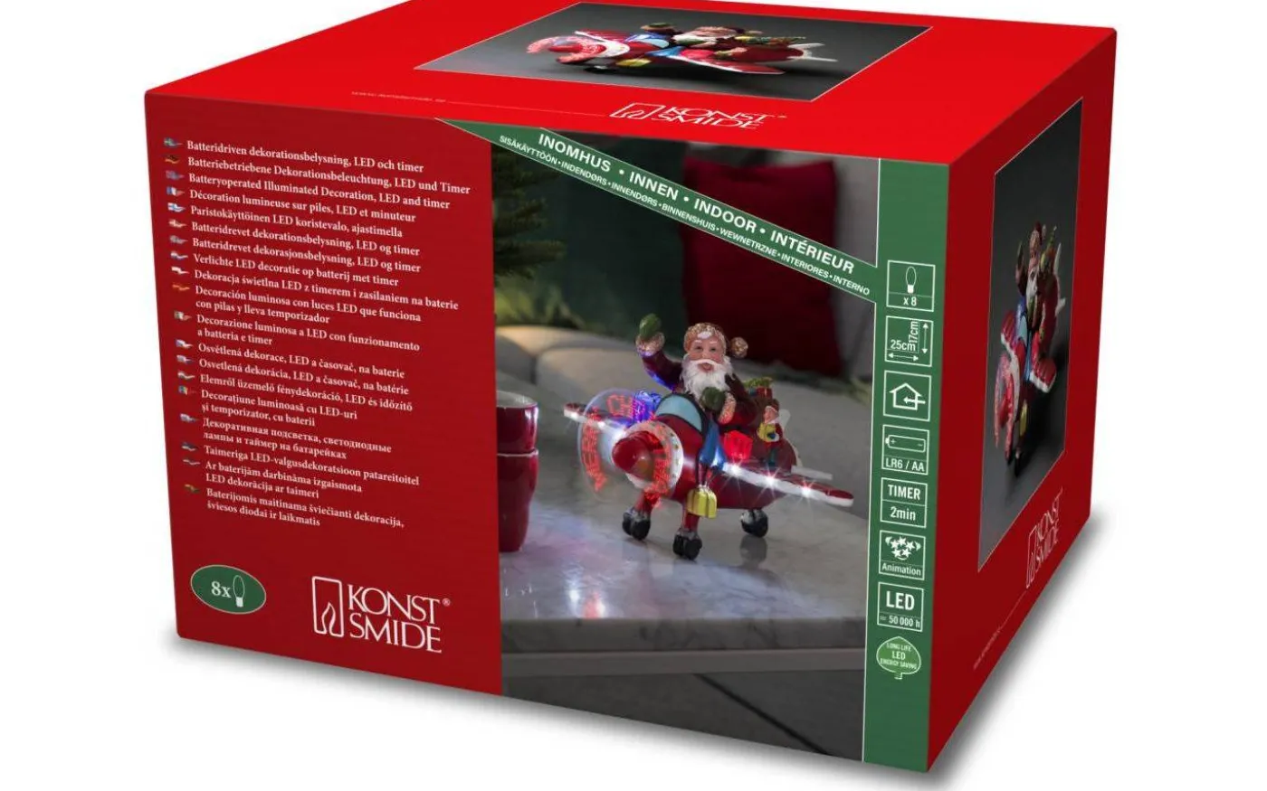Fantastisk juldekoration från Konstsmide i from av ett fiberoptiskt flygplan med en tomte bakom spakarna. Flygplanet har inbyggd sensor som vid enkel klappning med händerna aktiverar propellern där fram och texten ”Merry Christmas” lyser vackert upp. Timer på 2 minuter.