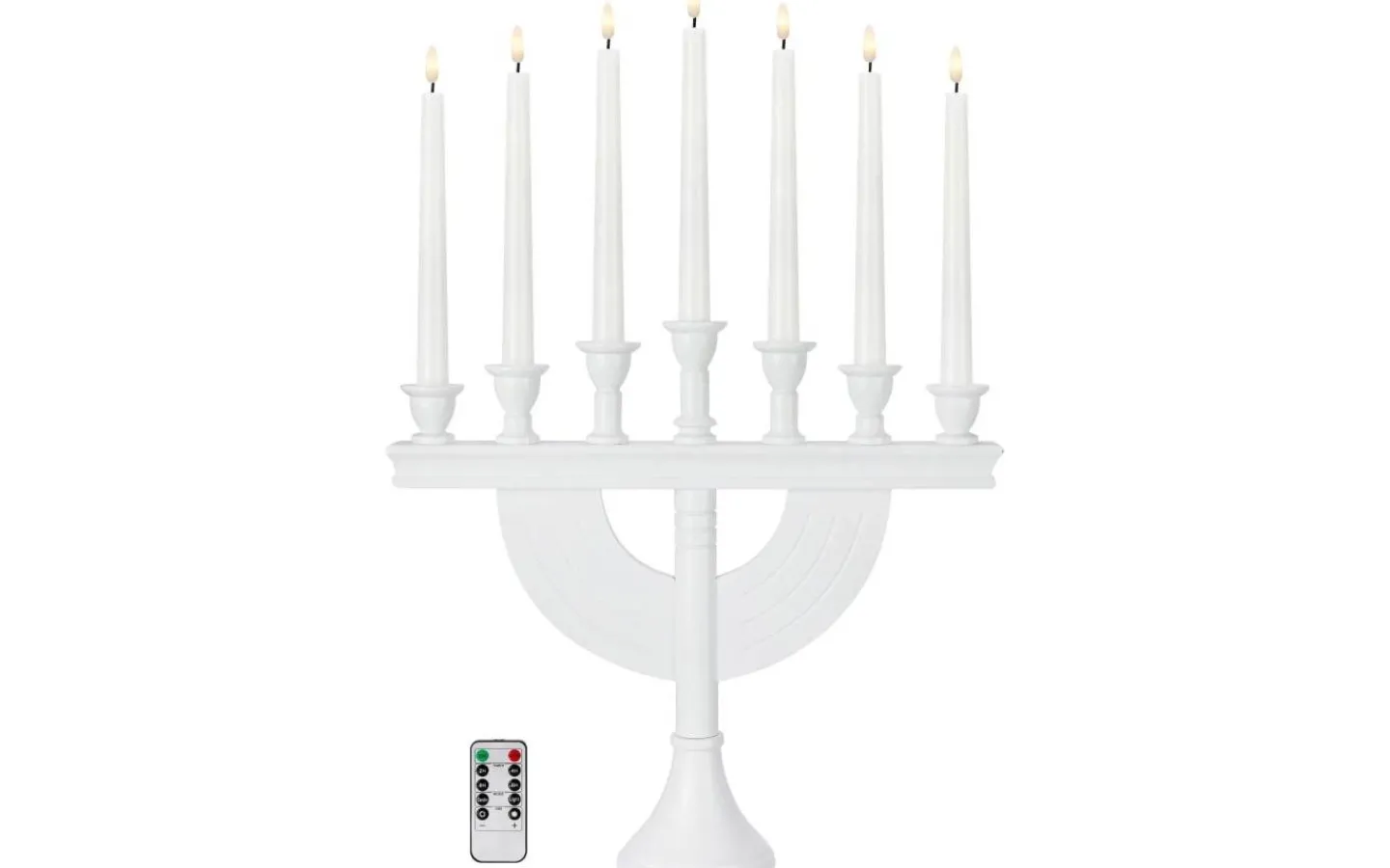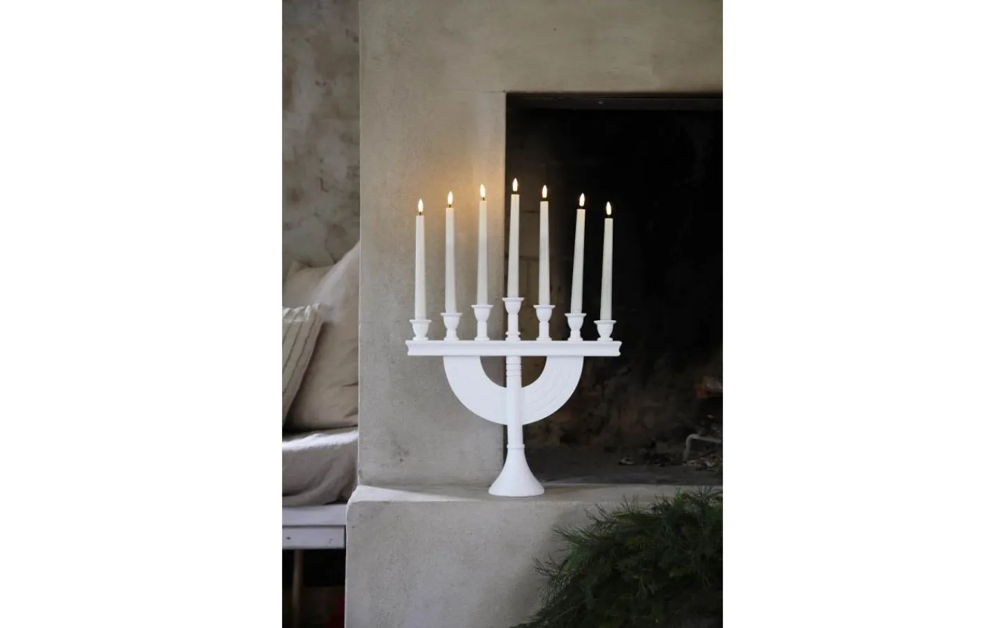 Torpa träljusstake från Markslöjd. Vit ljusstake med 7st fjärrstyrda LED waxljus. 2,4,6 och 8h timerfunktion. Ställbar ljuseffekt, konstant eller flamma. Konstant ljus i 4st dimbara steg. 25cm höga. Brytare under varje ljus. Drivs med 2xAAA batterier. Batterier ingår ej.