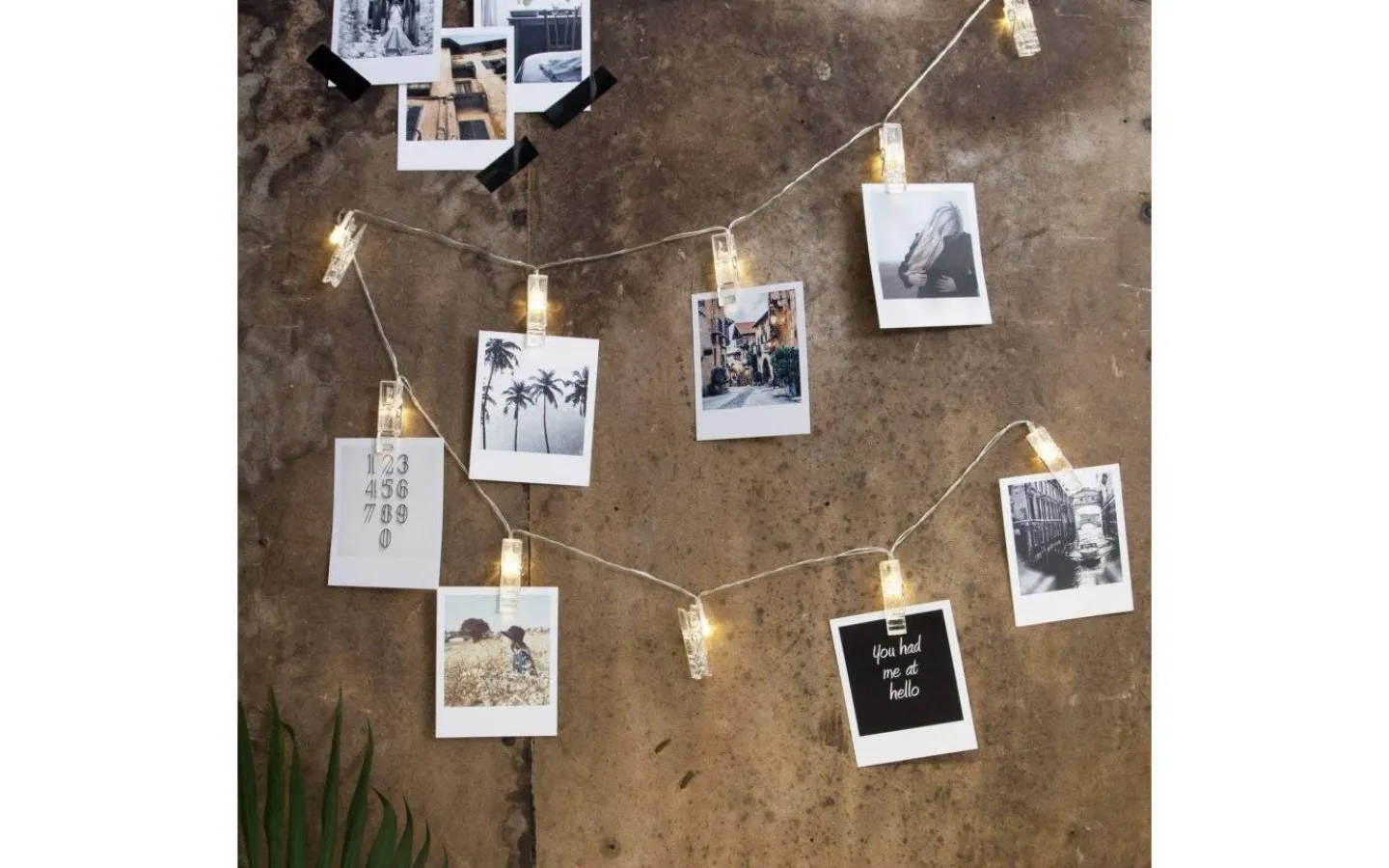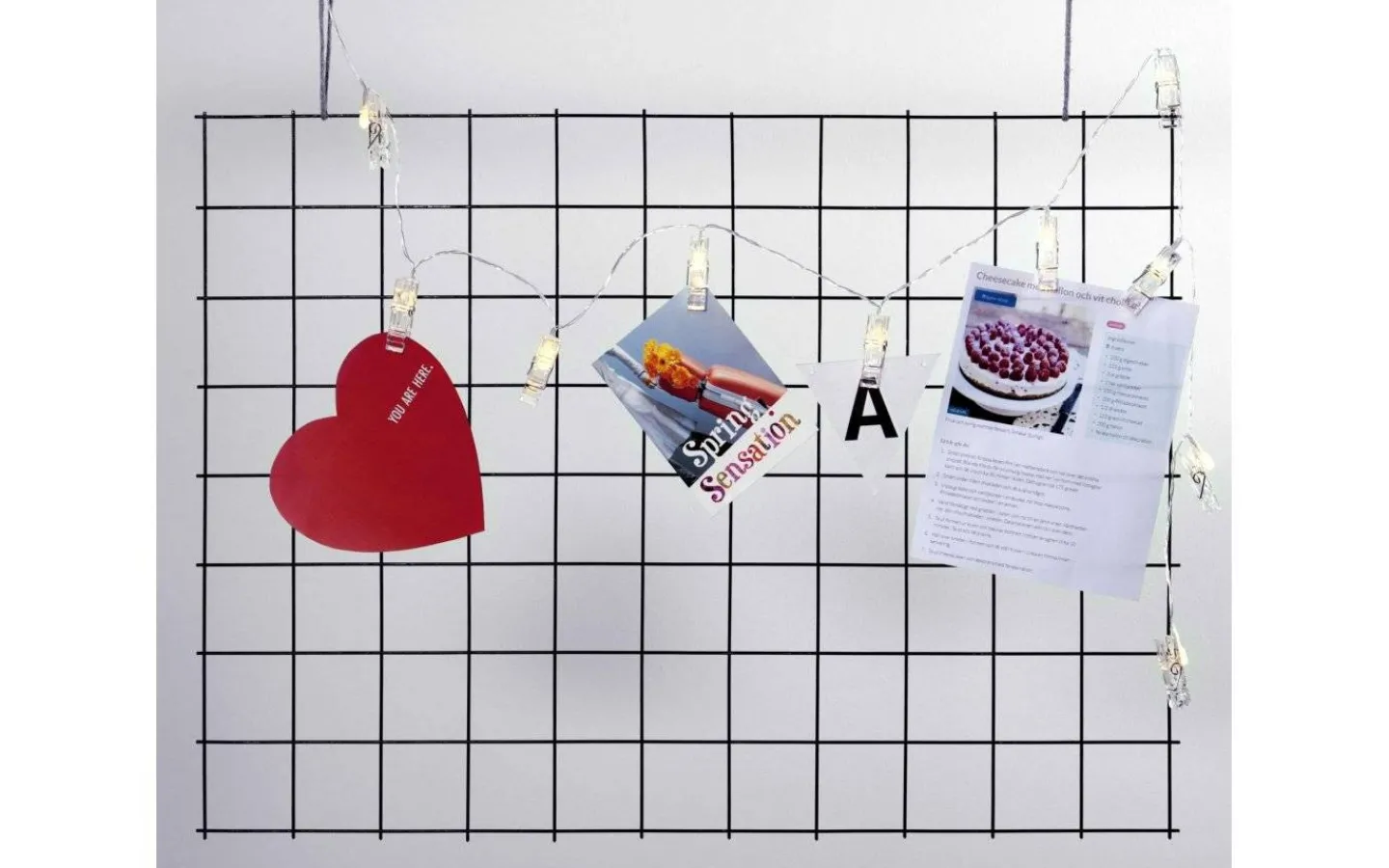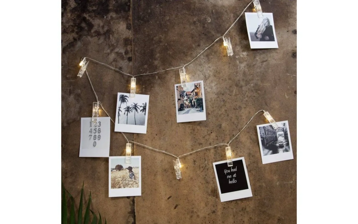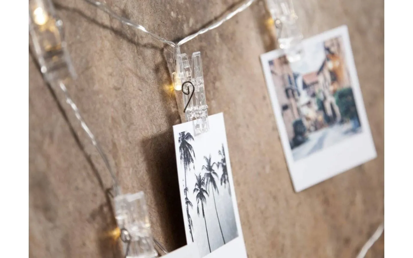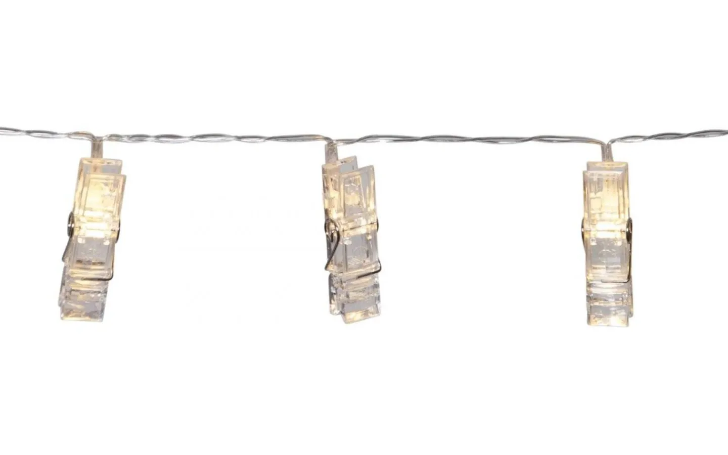 Batteridriven ljusslinga med tio transparenta klädnypor. Perfekt att hänga din favoritbilder i!I varje klädnypa finns en liten LED-lampa som avger ett mysigt ljussken.