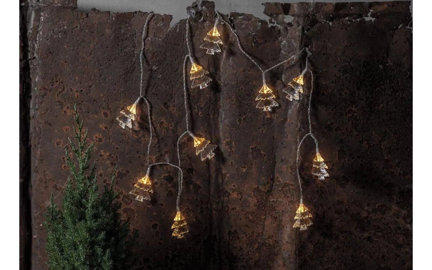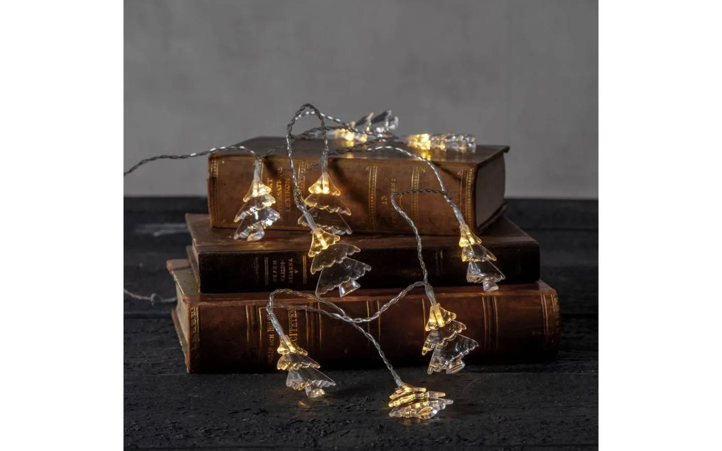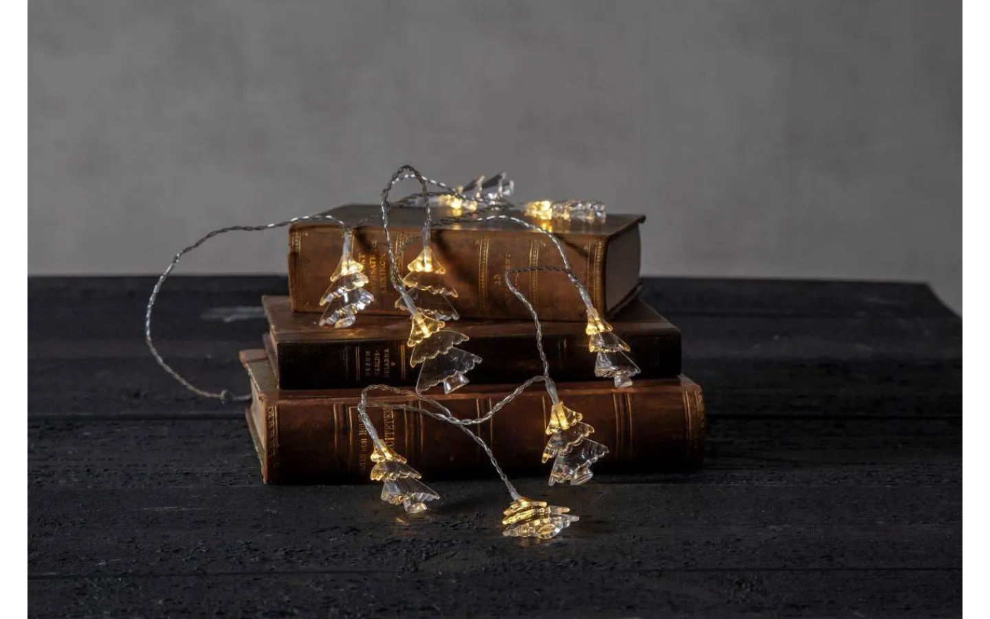 Batteridriven ljusslinga med transparenta dekorationer i form av julgran. Dekorativ inredning som ger ett mysigt sken i tex julgranen eller på bordet.