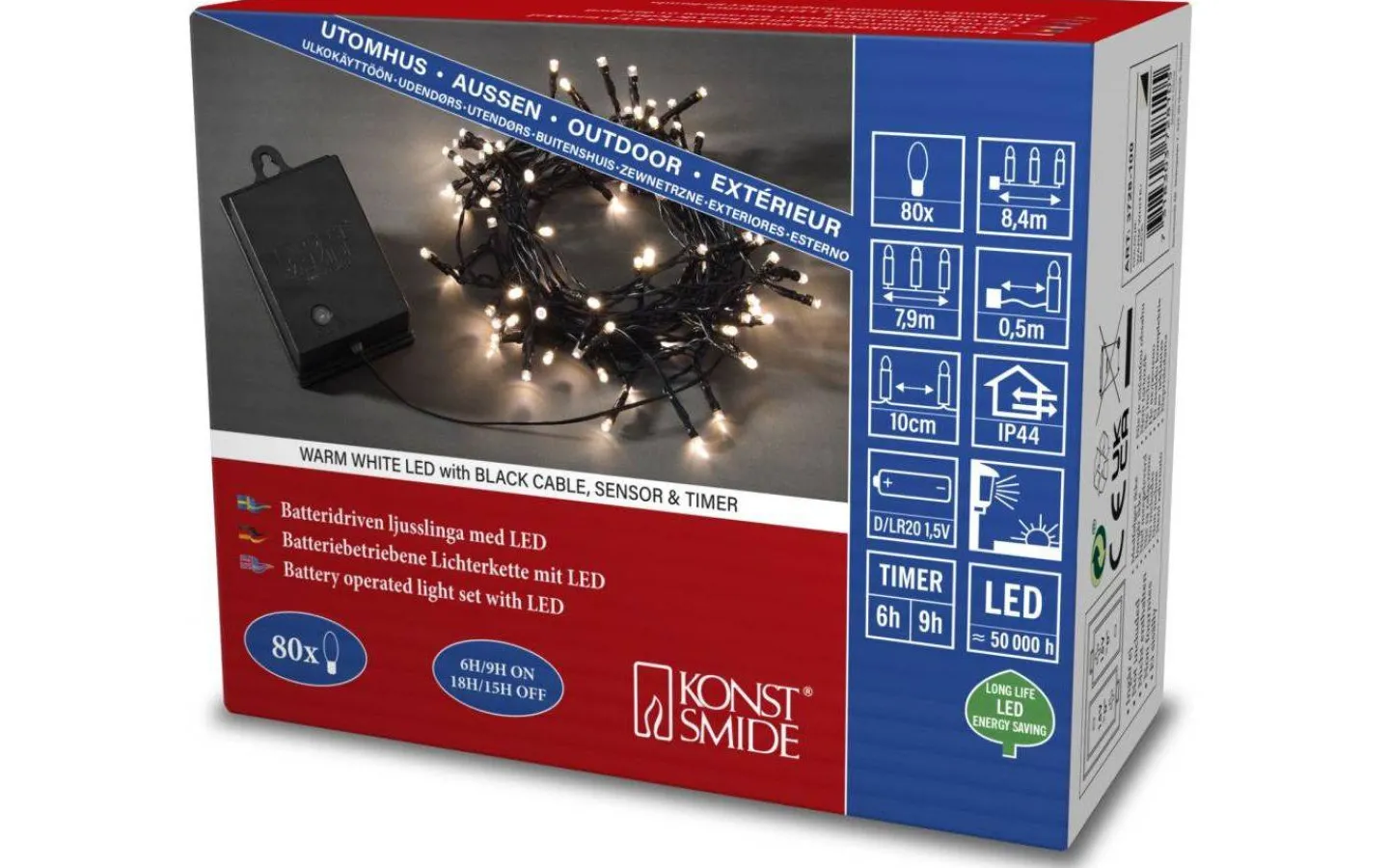 Batteridriven ljusslinga med skymningssensor från Konstsmide. Ljusslingan är 7,9m lång och har 80st små LED-lampor som lyser i ett härligt varmvitt ljussken. Perfekt att dekorera med utomhus för att skapa en riktigt härlig atmosfär.