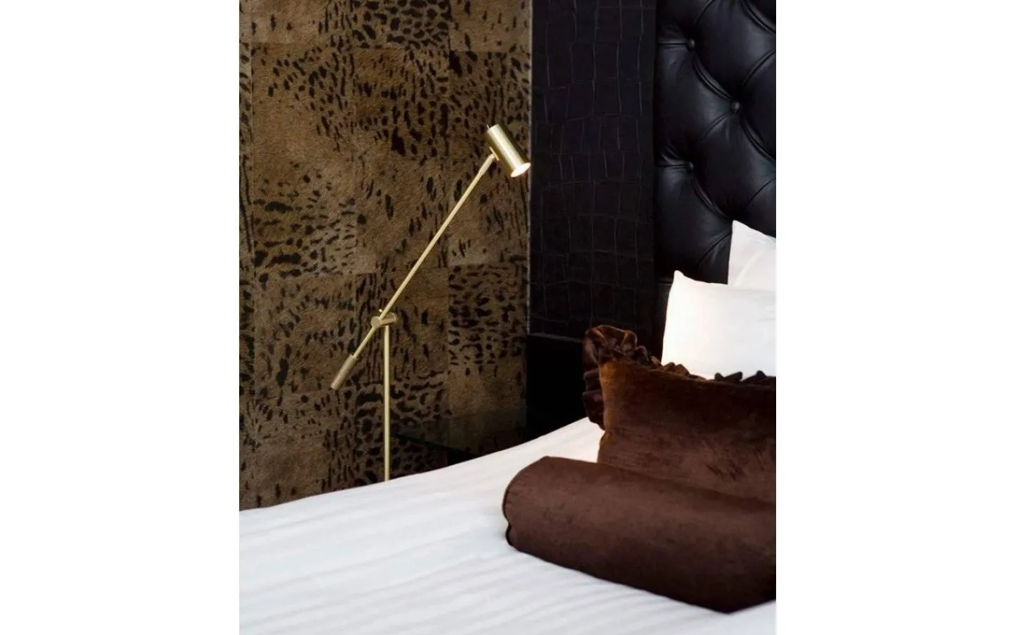 Golvlampan är tillverkad i metall med en lätt slipad mässingsfinish.