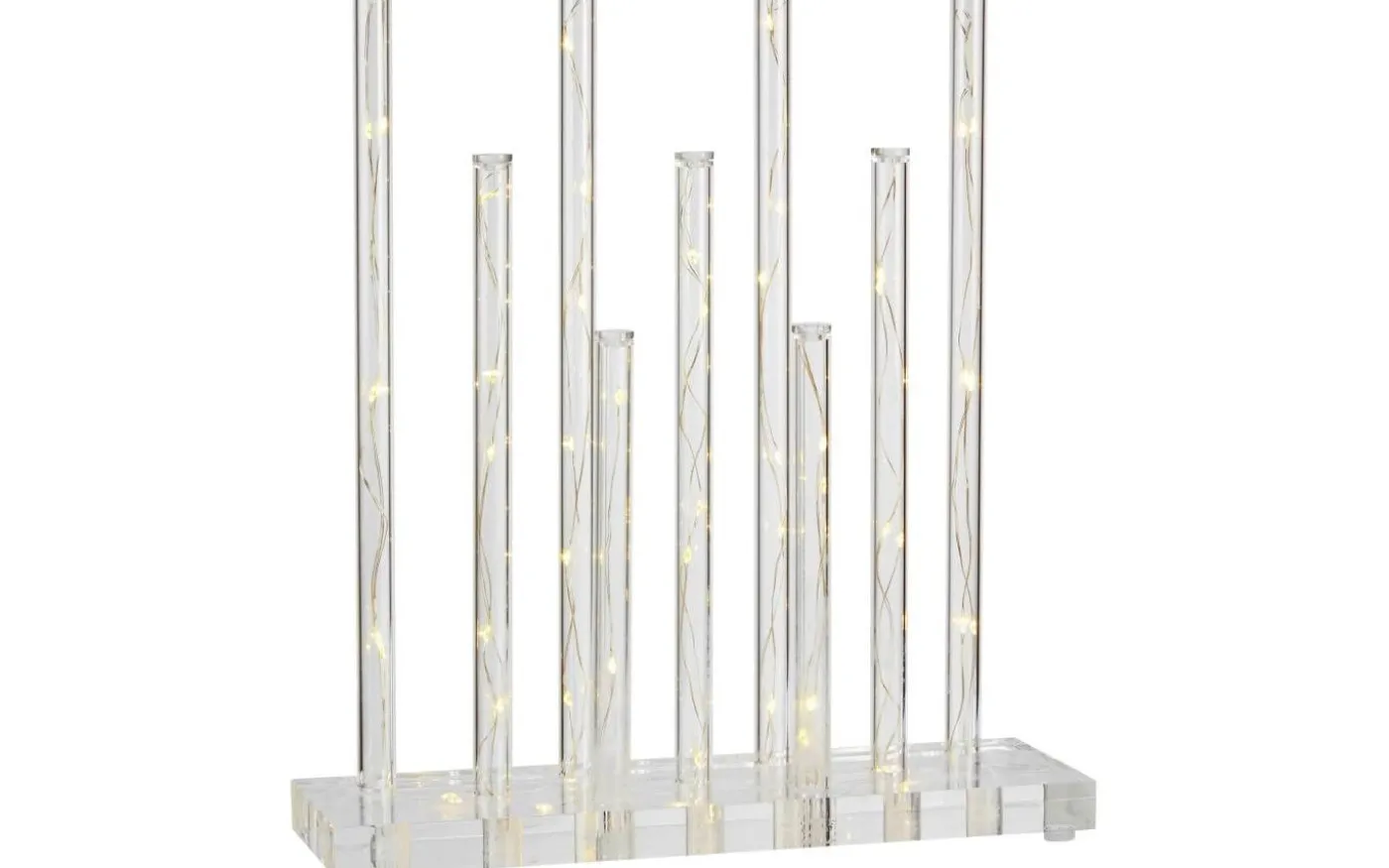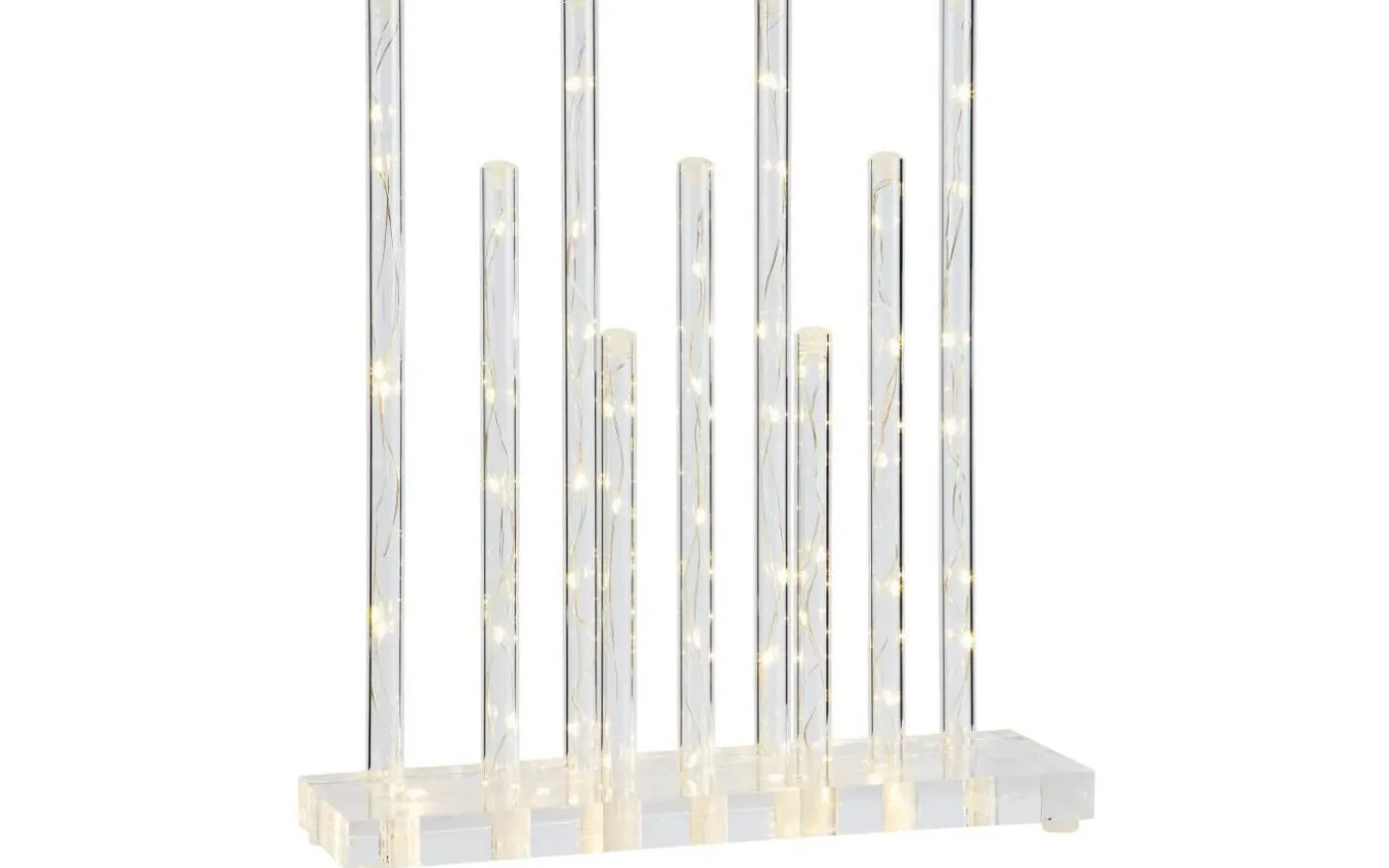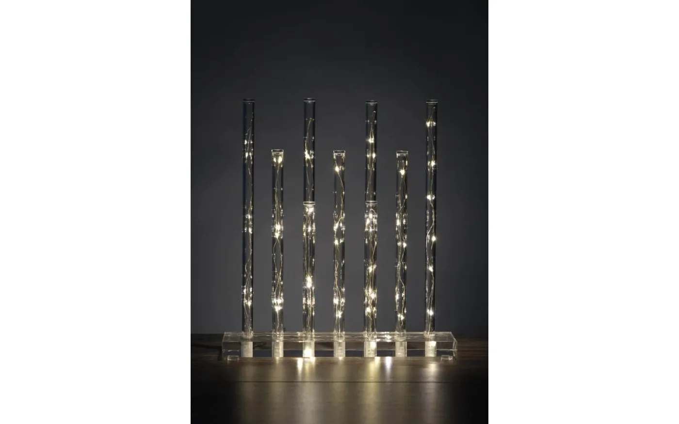 Ljusstake med nio transparenta stavar och bottenplatta som sprider ett behagligt ljussken. Ljuspunkterna i stavarna är fördelade över hela höjden och skapar en känsla av ett vattenfall med ljus. Stavarna möter basen som också har ljuspunkter för ett enhetligt uttryck. Den stilrena formgivningen och ljussättningen skapar en unik ljusstake som gör sig bra på många platser i hemmet, året om. Belysningen är 33cm hög, 30cm bred med transparent kabel som smälter in i omgivningen. Tekniskt: Ljusstaken har fast LED-belysning om 3,6W. 3m lång transparent kabel med plug-in transformator.