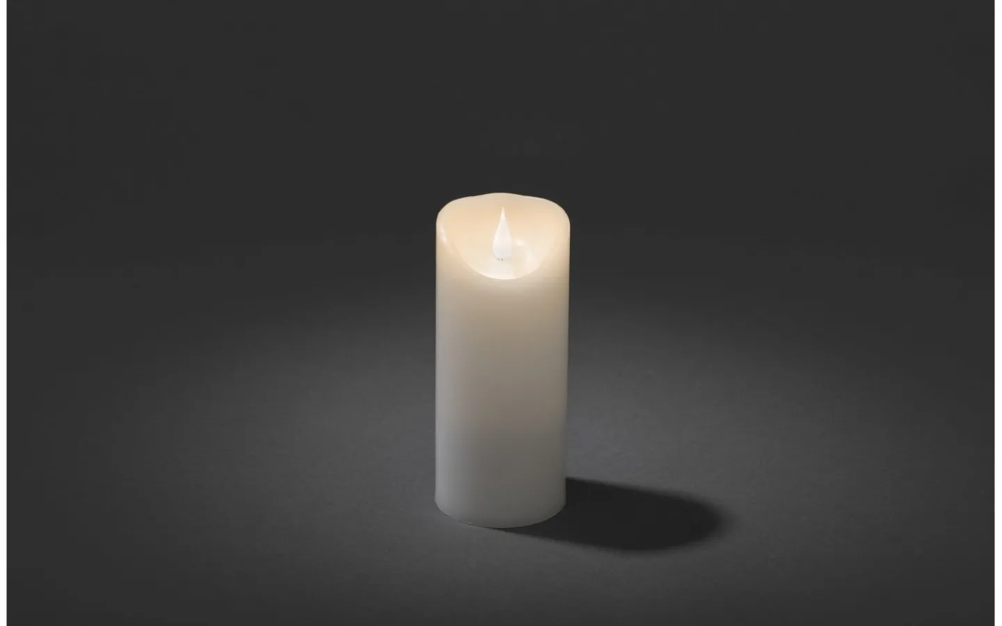 Vackert batteridrivet blockljus, från Konstsmide, gjort i vax med en vit finish. Detta batteridrivna ljus har en fin låga som lyser i ett varmvitt ljussken och skiftar i ljusstyrka för att avge ett verklighetstroget intryck.