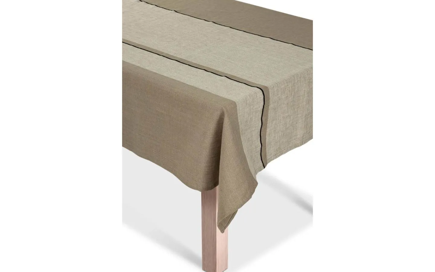 En modern beige duk med svart broderad rand i mitten som piffar upp din dukning. Finns matchande bordsunderlägg från samma serie. Tillverkad i 100% Europeisk linne (Euroflax). Storlek 156x250cm och kan tvättas i 40°. Tillverkad i Indien. Designad av Ann Ringstrand. Certifierad OEKO-TEX 100 vilket innebär att textilen är fri från skadliga kemikalier.