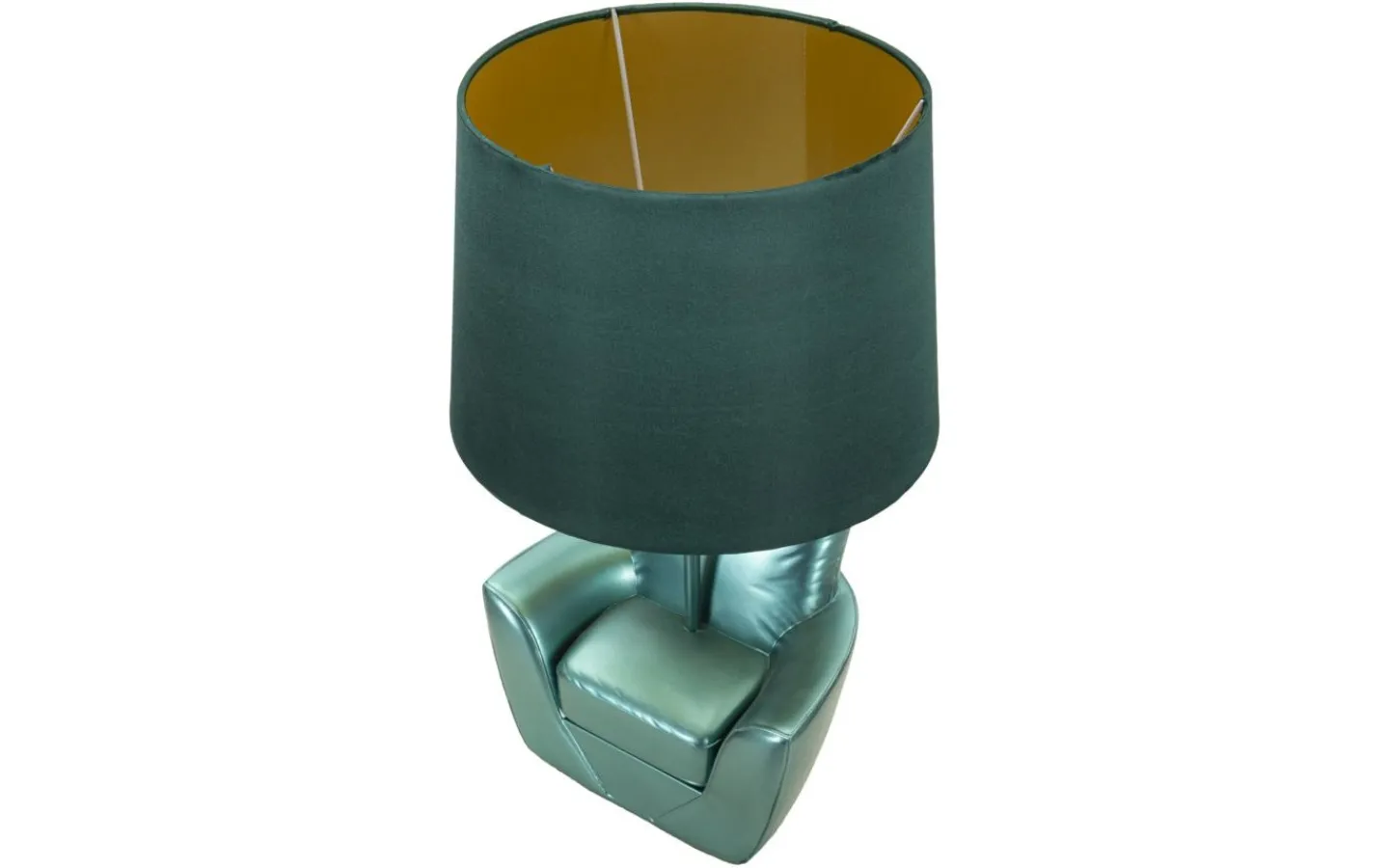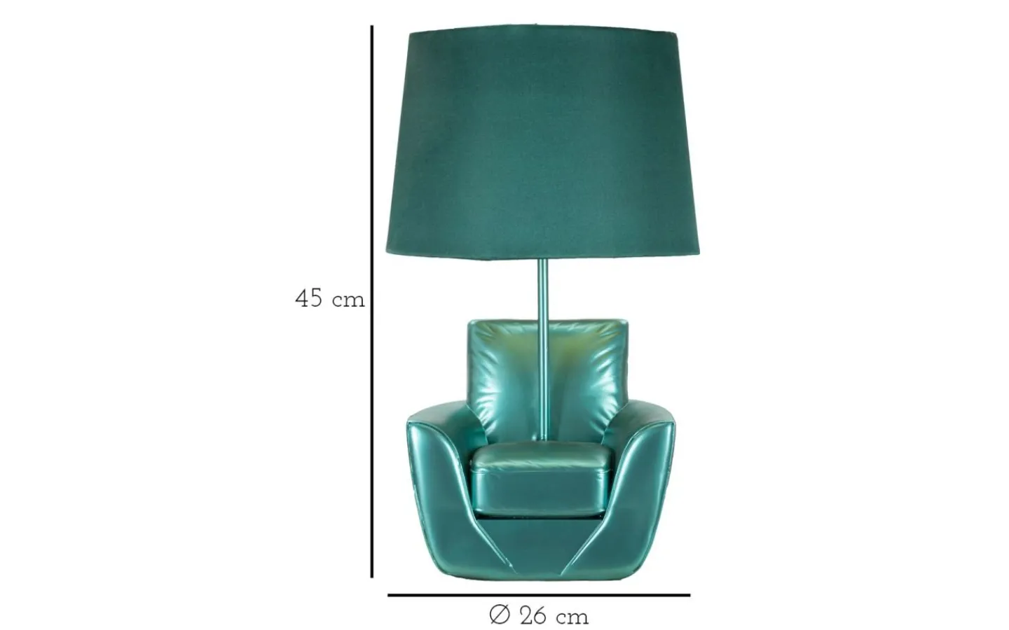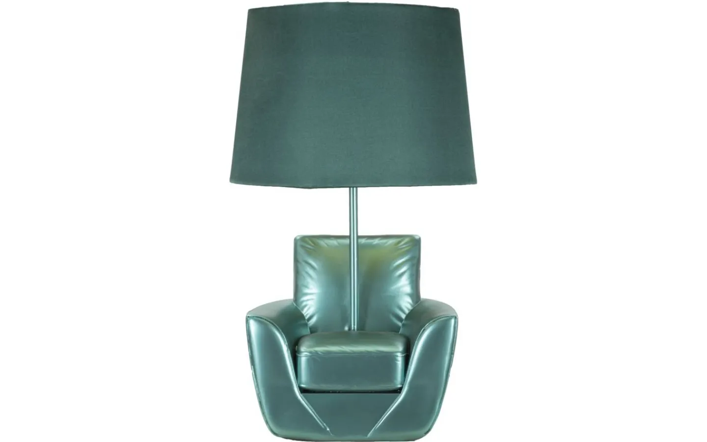 Bordslampa i turkos harts i form av en fåtölj inspirerad av 70-talet. Komplett med lampskärm i turkos tyg.