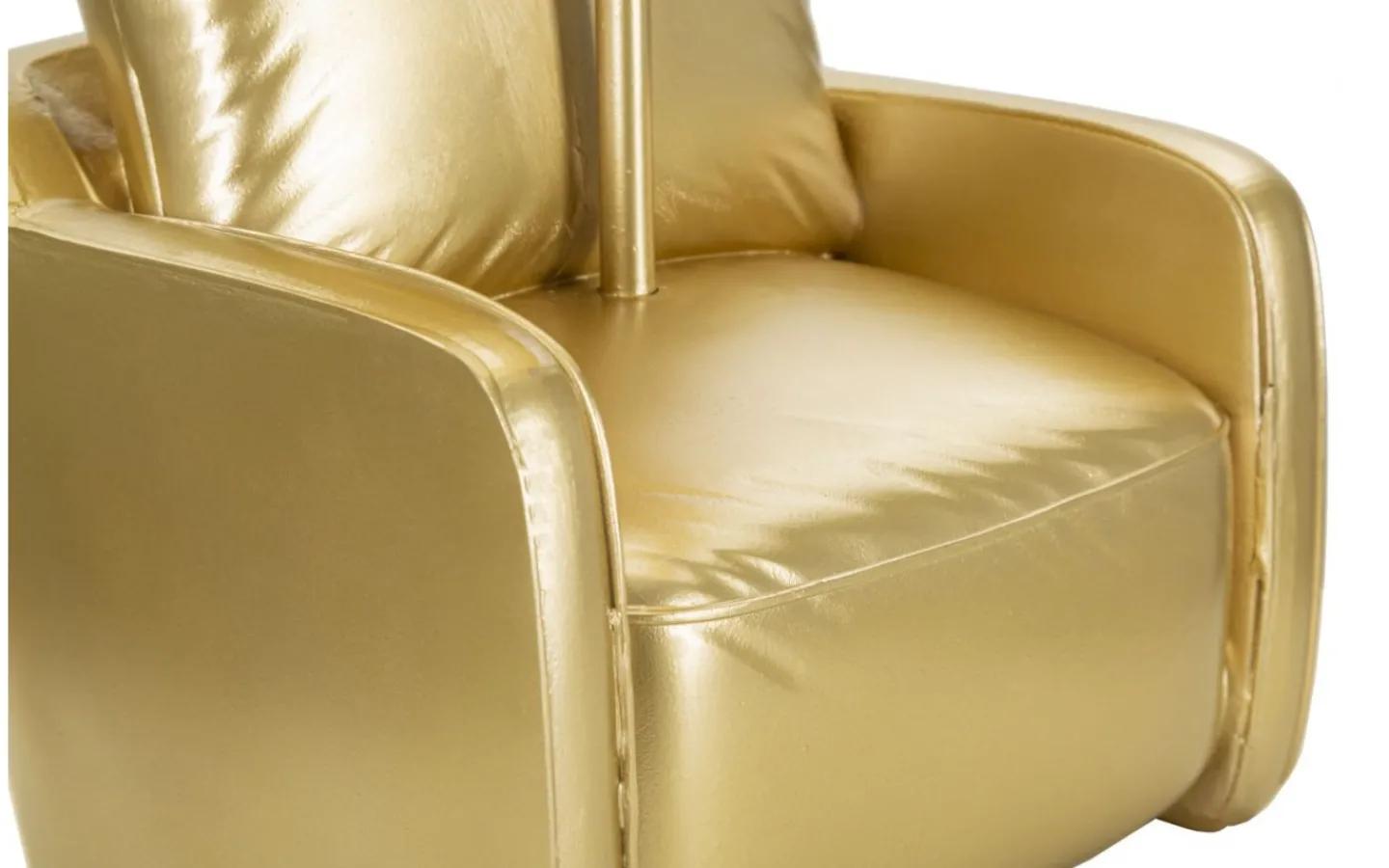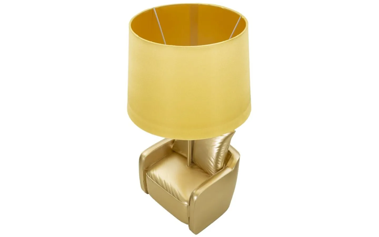 Fåtöljformad bordslampa i gyllene harts inspirerad av 70-talet. Komplett med lampskärm i gult ockra tyg.
