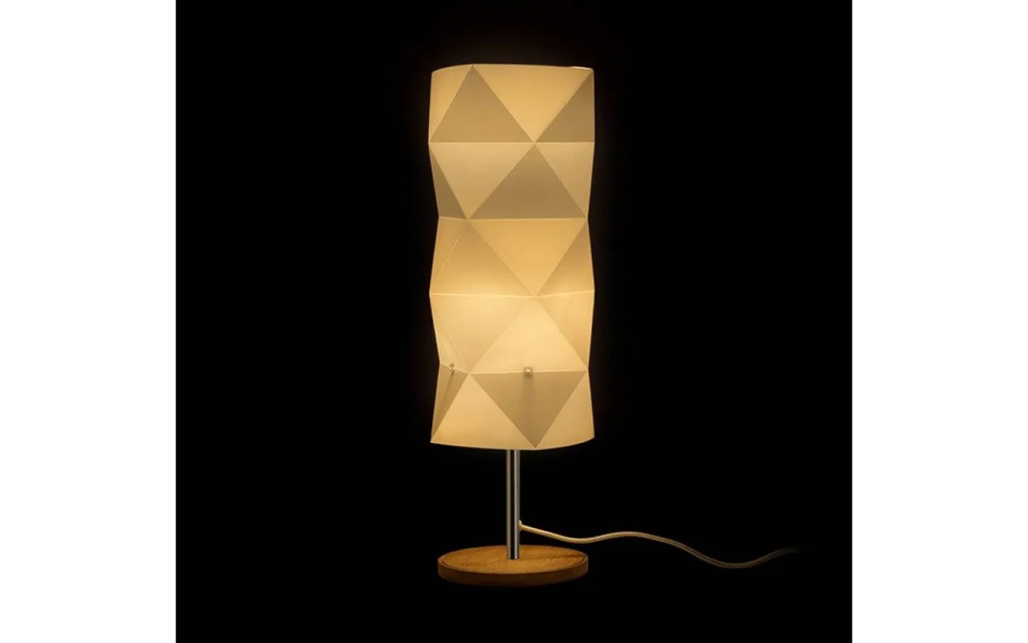 Bordslampan är 48,5cm hög och tillverkad av trä med skärm i plast och E14-sockel. Levereras med 1,5m vit anslutningskabel med brytare och stickkontakt för vägguttag.