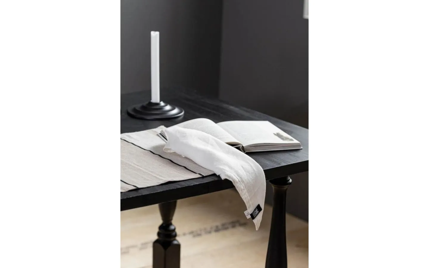 Exklusiv tallrikstablett med broderade smala svarta ränder. Tabletten passar de flesta dukningar och underlägget kan kompletteras med duken Öda. Tillverkad i 100% europeiskt linne (Euroflax). Storlek 45x35cm och kan tvättas i 40°. Tillverkad i Indien. Designad av Ann Ringstrand. Certifierad OEKO-TEX 100 vilket innebär att textilen är fri från skadliga kemikalier.