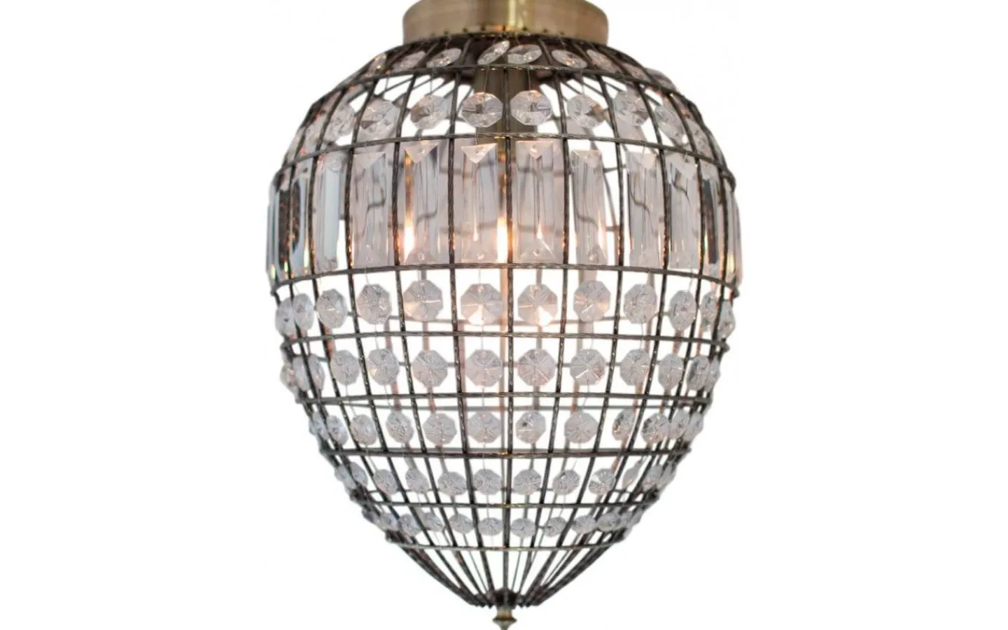 I droppens övre del sitter ett takfäste i antik metall. När plafonden är tänd ger glasprismorna lampan ett mjukt och behagligt ljus.