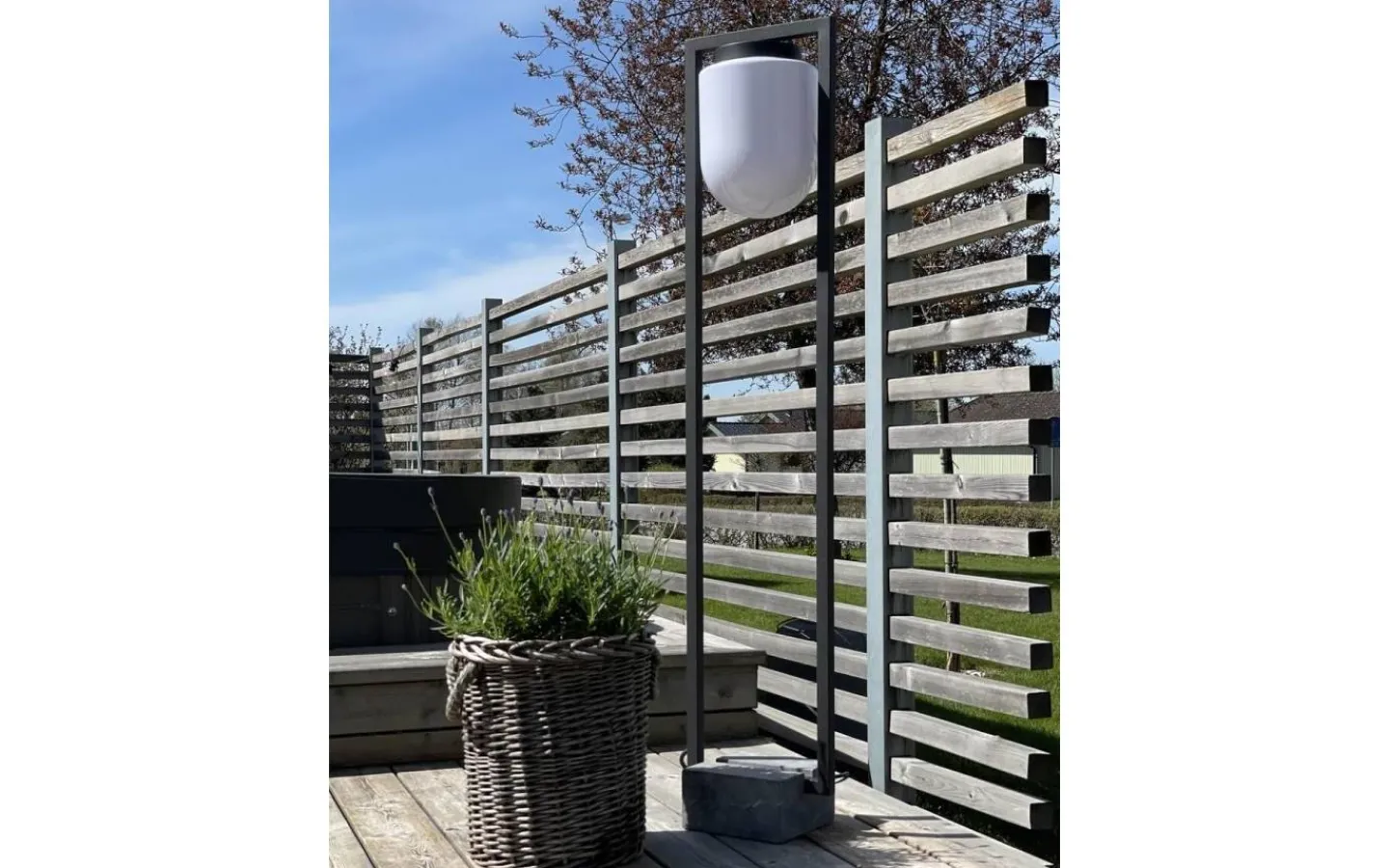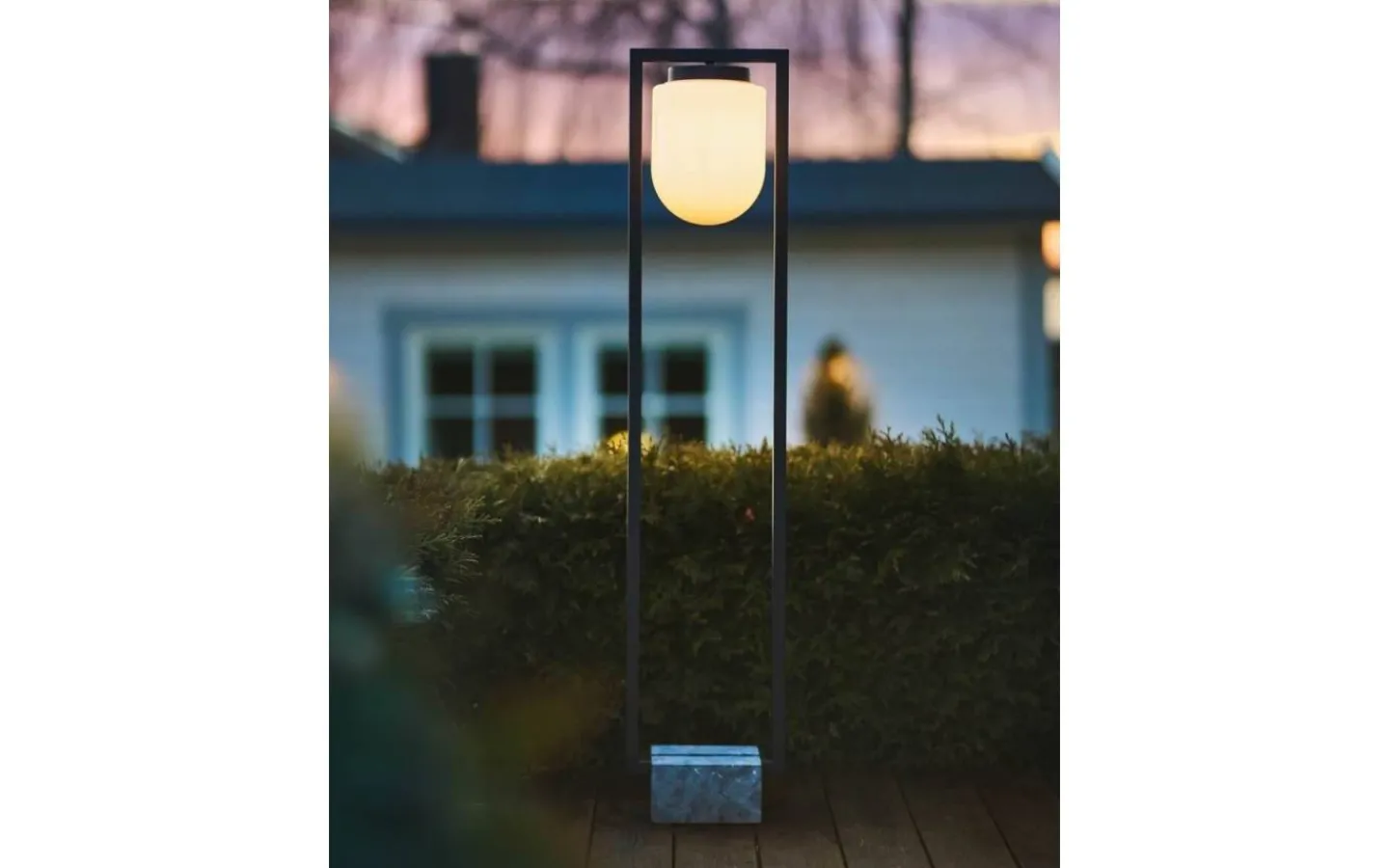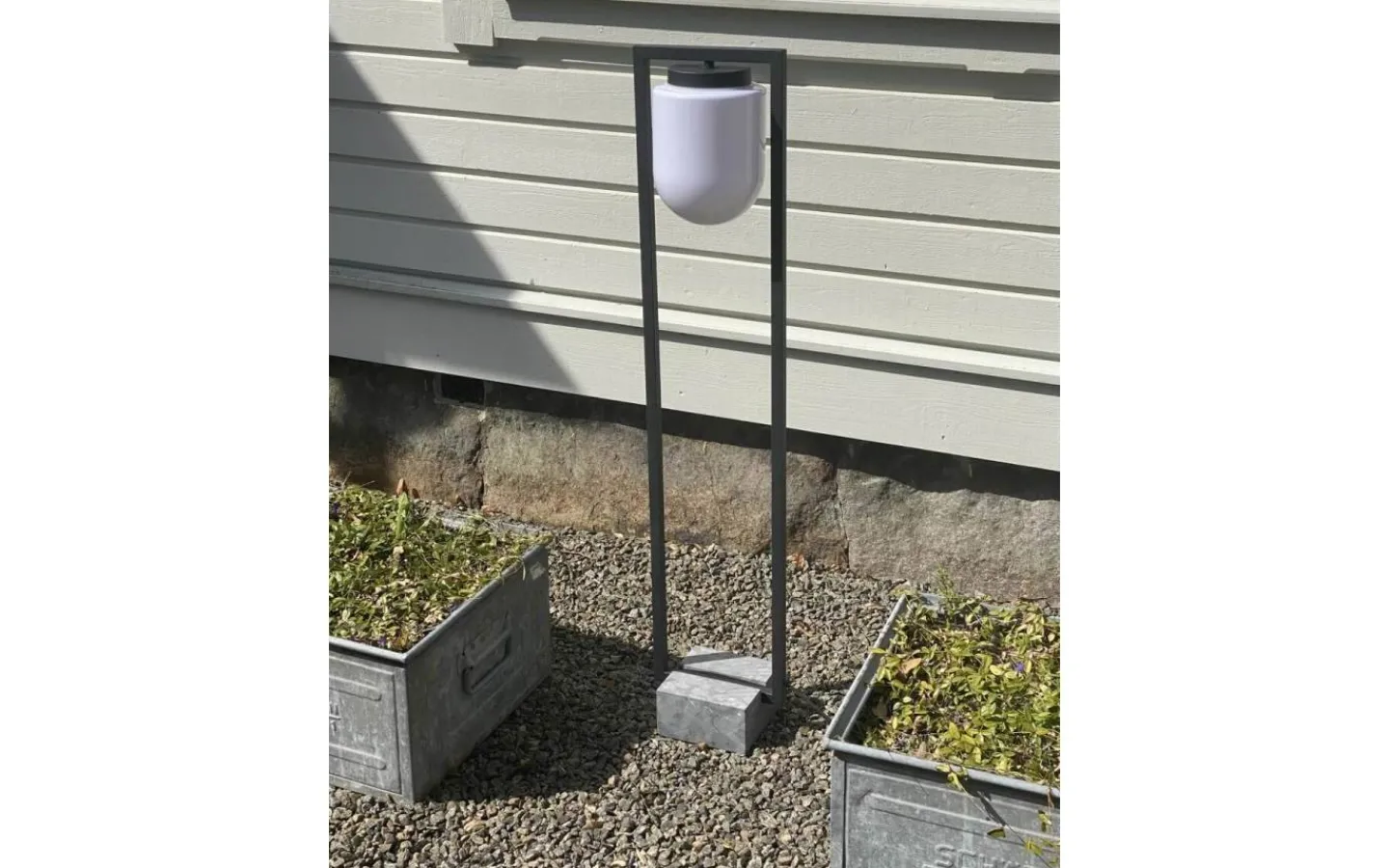 Lampan är tillverkad av sandsvart metall tillsammans med en UV-beständig opal plastglob och botten består av en tyngd vilket gör att lampan står stadigt och blir motståndskraftig mot vind och väder.