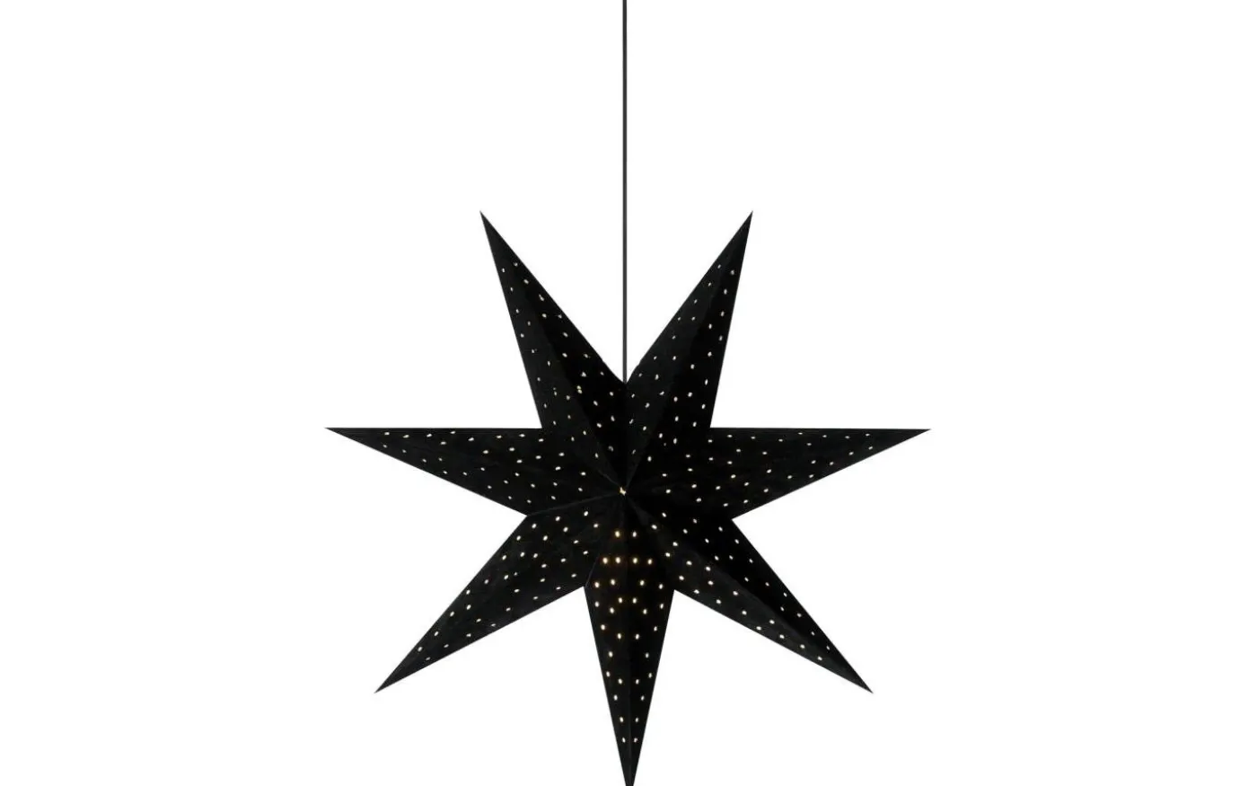 Clara är en pappersstjärna med sammetsfinish, här i svart med 45cm i diameter. Tekniskt : Lampan kräver en ljuskälla med liten sockel (E14) om max 25W eller motsvarande i LED, ingår ej. 3,5 m kabel med strömbrytare.