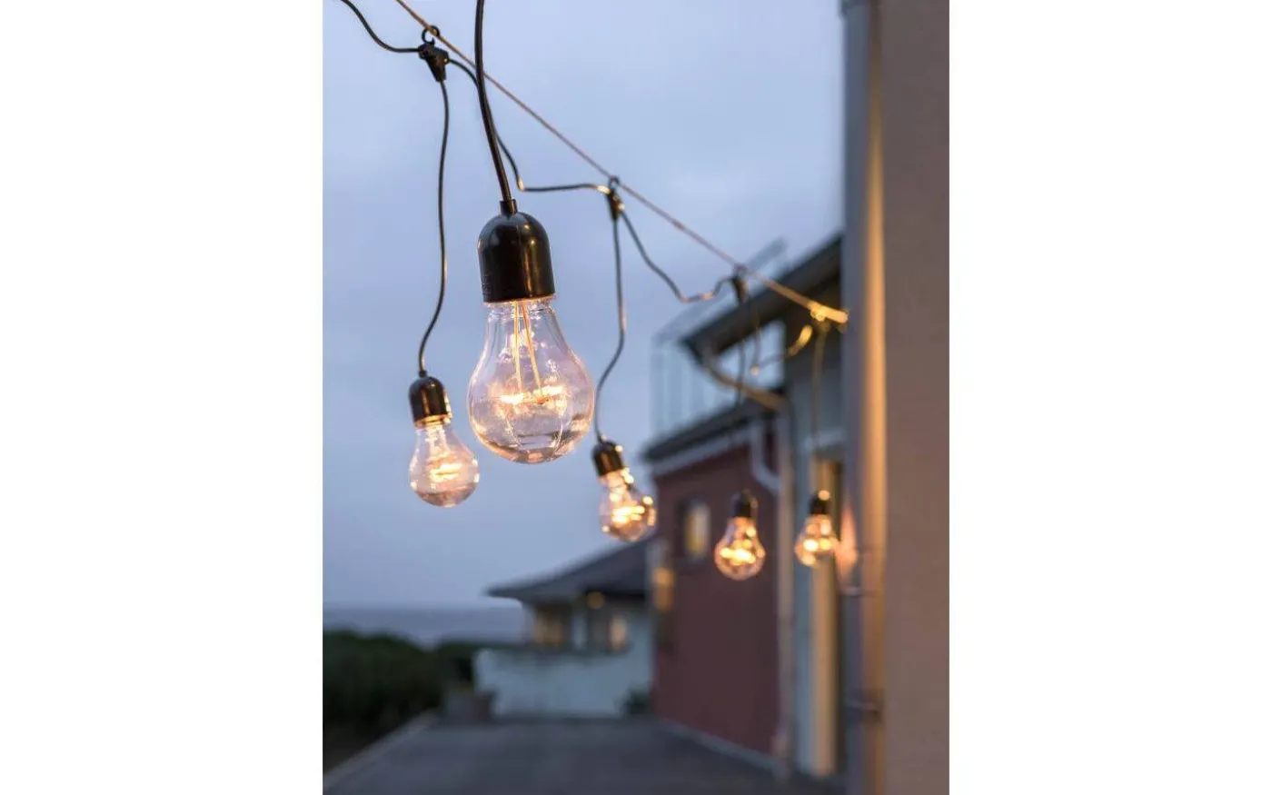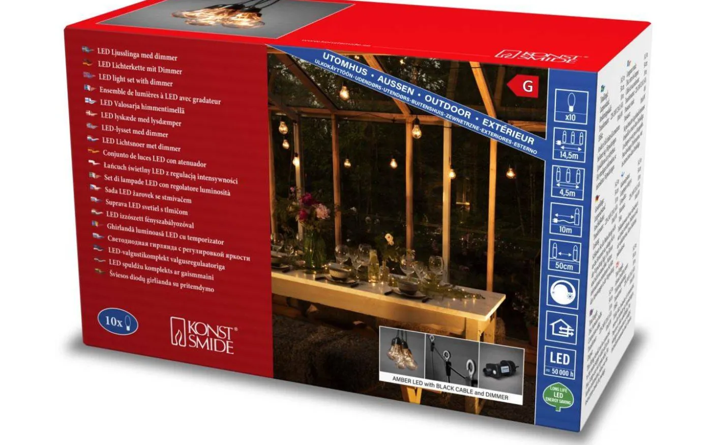 Clear ljusslinga från Konstsmide är en svart ljusslinga med 10st ljuskällor som lyser i ett svagt extra varmvitt ljussken. Varje ljuskälla är nedpendlad 40cm och har ett mellanrum på 50cm. På varje lamphållare finns det en liten krok i toppen för att underlätta placering.