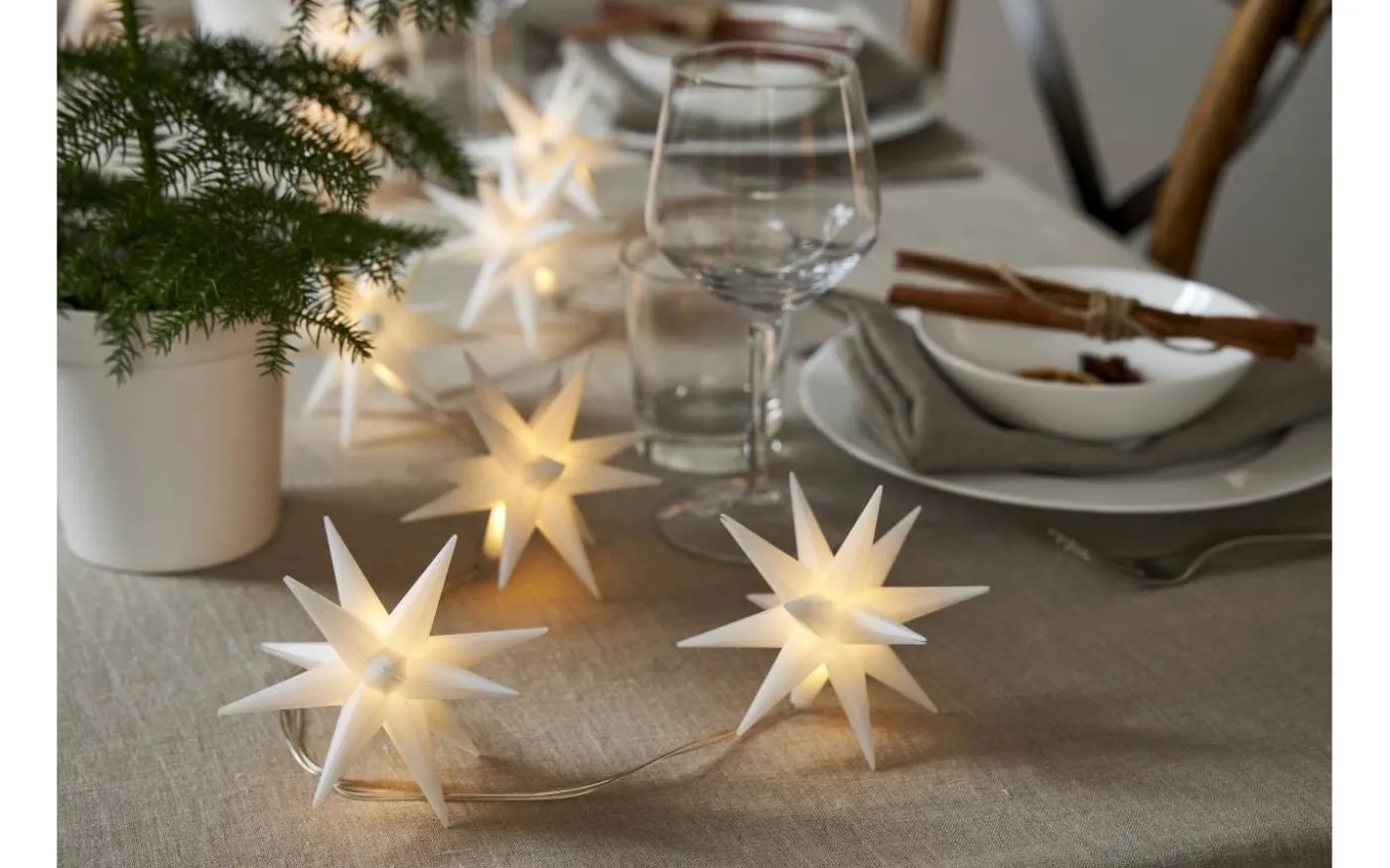 Vackra December ljusslinga från Star Trading har 8st små vita moravianstjärnor. Inuti varje liten stjärna sitter en liten LED-lampa som avger ett härligt varmvitt ljussken. Den perfekta juldekorationen som garanterat förhöjer stämningen juletid!