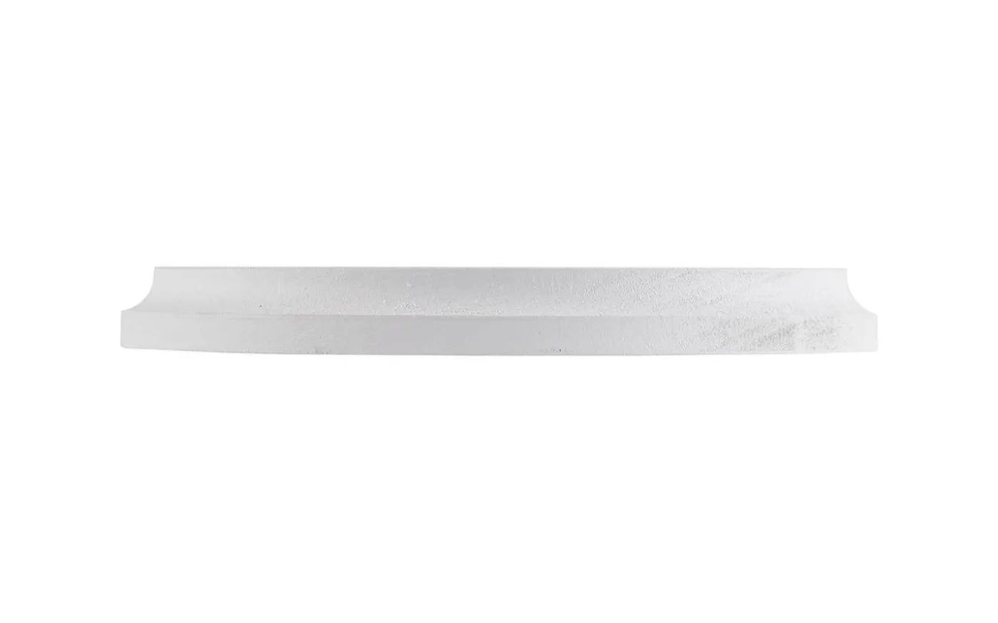Distansplatta för vägg- och taklampor. Genom att såga upp spår i plattan möjliggörs ingång från sidan med kuloledning. Fyller även en rent dekorativ funktion. Distansplattan har inga skruvhål, utan kläms fast bakom armaturens fästplatta. Vitmålad björk 12×120 mm