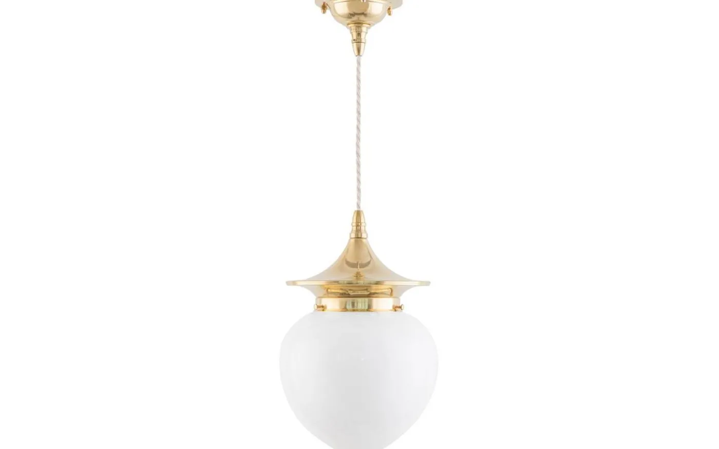 En klassisk droppformad kupa i vitt överfångsglas. Slutna vita kupor blev vanligt förkommande först på 1920-talet – innan dess var det slipat eller matterat klarglas som inte ansågs dämpa glödlampan sken i samma utsträckning.
