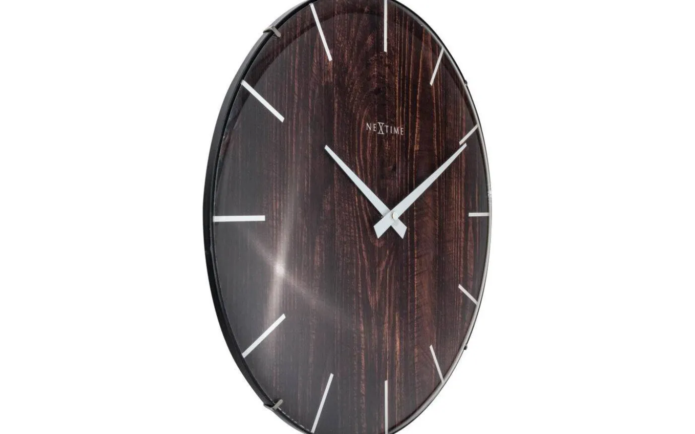 Edge Wood Dome från NeXtime är en väggklocka med bakgrund i mörkt trä och vita detaljer.